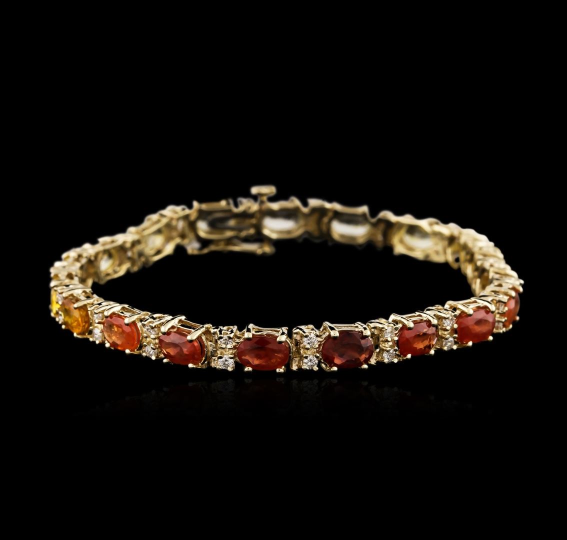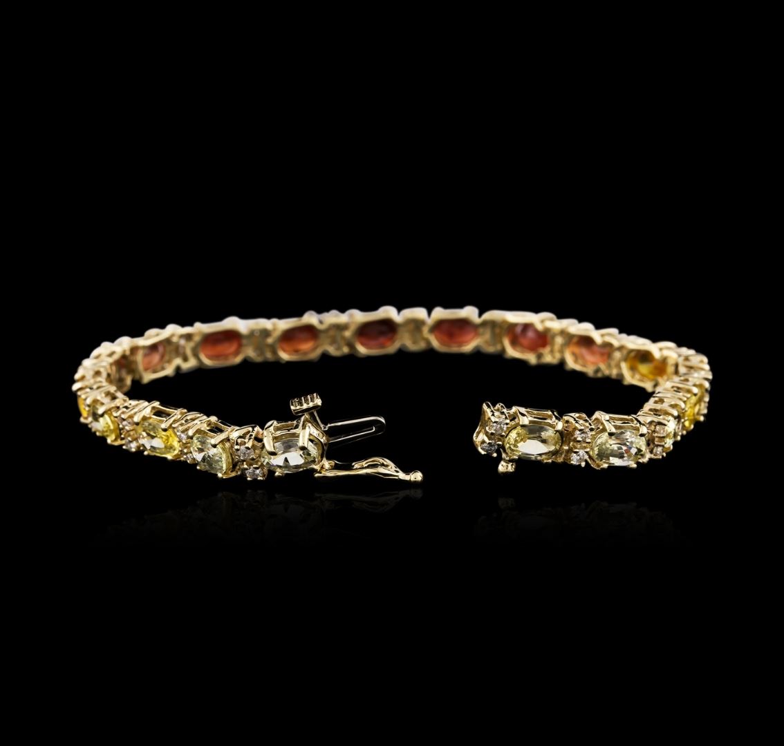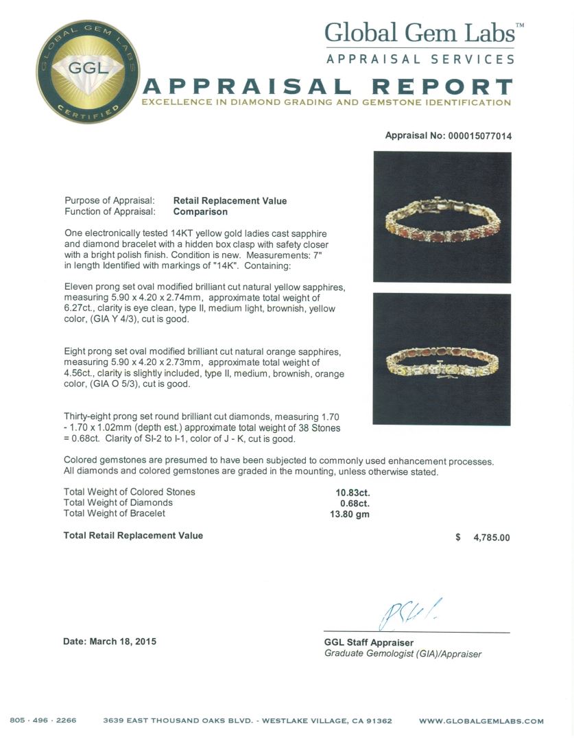 One electronically tested 14KT yellow gold ladies cast sapphire and diamond bracelet with a hidden box clasp with safety closer with a bright polish finish. Measurements: 7" in length Identified with markings of "14K". Condition is new. Containing: Eleven prong set oval modified brilliant cut natural yellow sapphires, measuring 5.90 x 4.20 x 2.74mm, approximate total weight of 6.27ct., clarity is eye clean, type II, medium light, brownish, yellow color, (GIA Y 4/3), cut is good. Eight prong set oval modified brilliant cut natural orange sapphires, measuring 5.90 x 4.20 x 2.73mm, approximate total weight of 4.56ct., clarity is slightly included, type II, medium, brownish, orange color, (GIA O 5/3), cut is good. Thirty-Eight prong set round brilliant cut diamonds, measuring 1.70 - 1.70 x 1.02mm (depth est.) approximate total weight of 38 Stones = 0.68ct. Clarity of SI-2 to I-1, Color of J - K, Cut is Good. Colored gemstones are presumed to have been subjected to commonly used enhancement processes. All diamonds and colored gemstones are graded in the mounting, unless otherwise stated. Total Weight of Colored Stones 10.83ct. Total Weight of Diamonds 0.68ct. Total Weight of Bracelet 13.80 grams. GGL Appraised at $4,785.00.