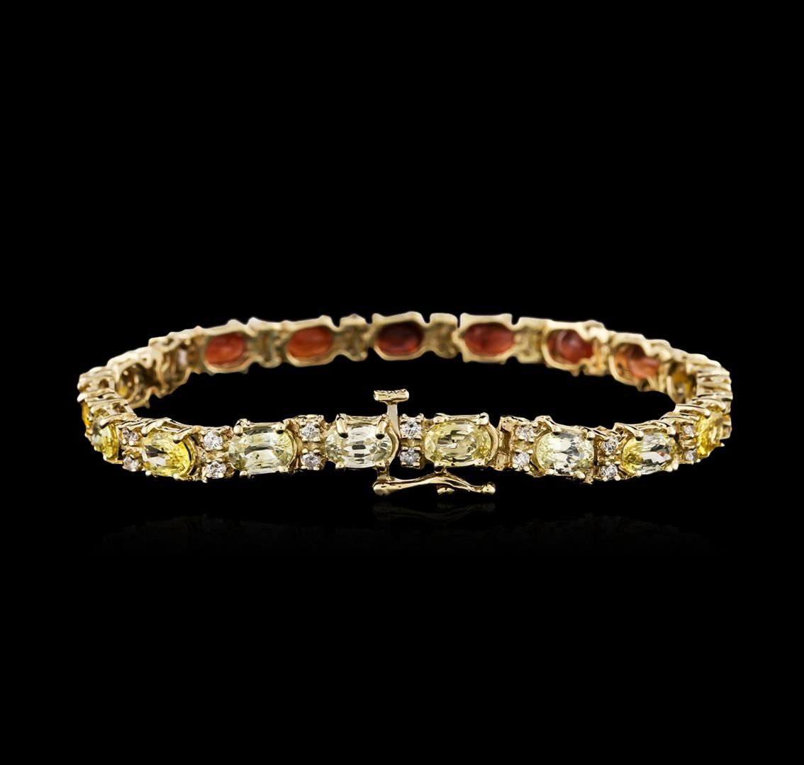 One electronically tested 14KT yellow gold ladies cast sapphire and diamond bracelet with a hidden box clasp with safety closer with a bright polish finish. Measurements: 7" in length Identified with markings of "14K". Condition is new. Containing: Eleven prong set oval modified brilliant cut natural yellow sapphires, measuring 5.90 x 4.20 x 2.74mm, approximate total weight of 6.27ct., clarity is eye clean, type II, medium light, brownish, yellow color, (GIA Y 4/3), cut is good. Eight prong set oval modified brilliant cut natural orange sapphires, measuring 5.90 x 4.20 x 2.73mm, approximate total weight of 4.56ct., clarity is slightly included, type II, medium, brownish, orange color, (GIA O 5/3), cut is good. Thirty-Eight prong set round brilliant cut diamonds, measuring 1.70 - 1.70 x 1.02mm (depth est.) approximate total weight of 38 Stones = 0.68ct. Clarity of SI-2 to I-1, Color of J - K, Cut is Good. Colored gemstones are presumed to have been subjected to commonly used enhancement processes. All diamonds and colored gemstones are graded in the mounting, unless otherwise stated. Total Weight of Colored Stones 10.83ct. Total Weight of Diamonds 0.68ct. Total Weight of Bracelet 13.80 grams. GGL Appraised at $4,785.00.