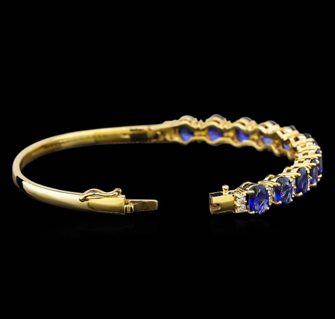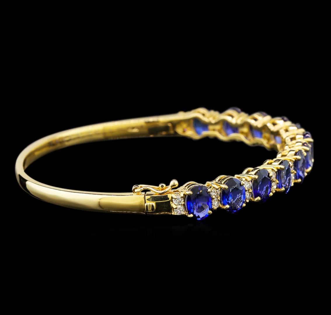 One electronically tested 14KT yellow gold ladies cast sapphire and diamond bangle bracelet with a hidden box clasp with safety closer with a bright polish finish. Identified with markings of "14K". Condition is new. Containing: Twelve prong set oval modified brilliant cut natural blue sapphires, measuring 7.00. x 5.50 x 3.58mm, approximate total weight of 11.10ct., clarity is eye clean, type II, medium light, moderately strong, blue color, (GIA B 4/4), cut is good. Twenty-Six prong set round brilliant cut diamonds, measuring 2.00. - 2.00. x 1.20mm (depth est.) approximate total weight of 26 Stones = 0.87ct. Clarity: SI-1. Color: I - J, Cut is Good. Colored gemstones are presumed to have been subjected to commonly used enhancement processes. All diamonds and colored gemstones are graded in the mounting, unless otherwise stated. Total Weight of Colored Stones 11.10ct. Total Weight of Diamonds 0.87ct. Total Weight of Bangle Bracelet 20.40 grams. GGL Appraised at $6,160.00.