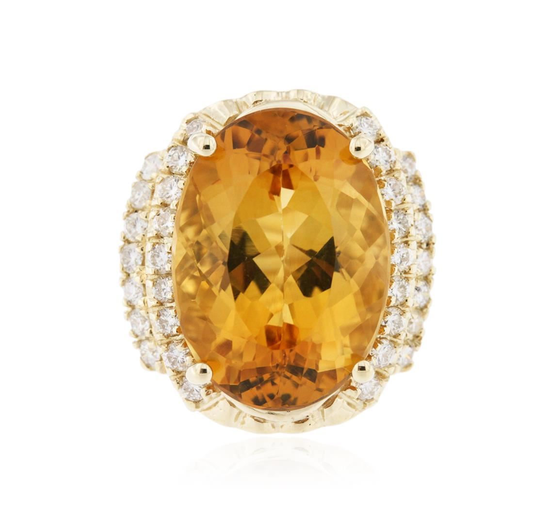 One electronically tested 14KT yellow gold ladies cast citrine and diamond ring with a bright polish finish. Identified with markings of "14K". Condition is new. Containing: One prong set oval modified brilliant cut natural citrine quartz, measuring 18.24 x 12.99 x 8.44mm, approximate weight of 11.17ct., clarity is eye clean, type I, medium light, brownish, orangy yellow color, (GIA oY 4/3), cut is good. Thirty-Two prong set round brilliant cut diamonds, measuring 1.50 - 1.50 x 0.90mm (depth est.) approximate total weight of 32 Stones = 0.39ct. Clarity: SI-2 to I-1. Color: I - J, Cut is Good. Colored gemstones are presumed to have been subjected to commonly used enhancement processes. All diamonds and colored gemstones are graded in the mounting, unless otherwise stated. Total Weight of Colored Stones 11.17ct. Total Weight of Diamonds 0.39ct. Total Weight of Ring 10.70 grams. GGL Appraised at $5,035.00.