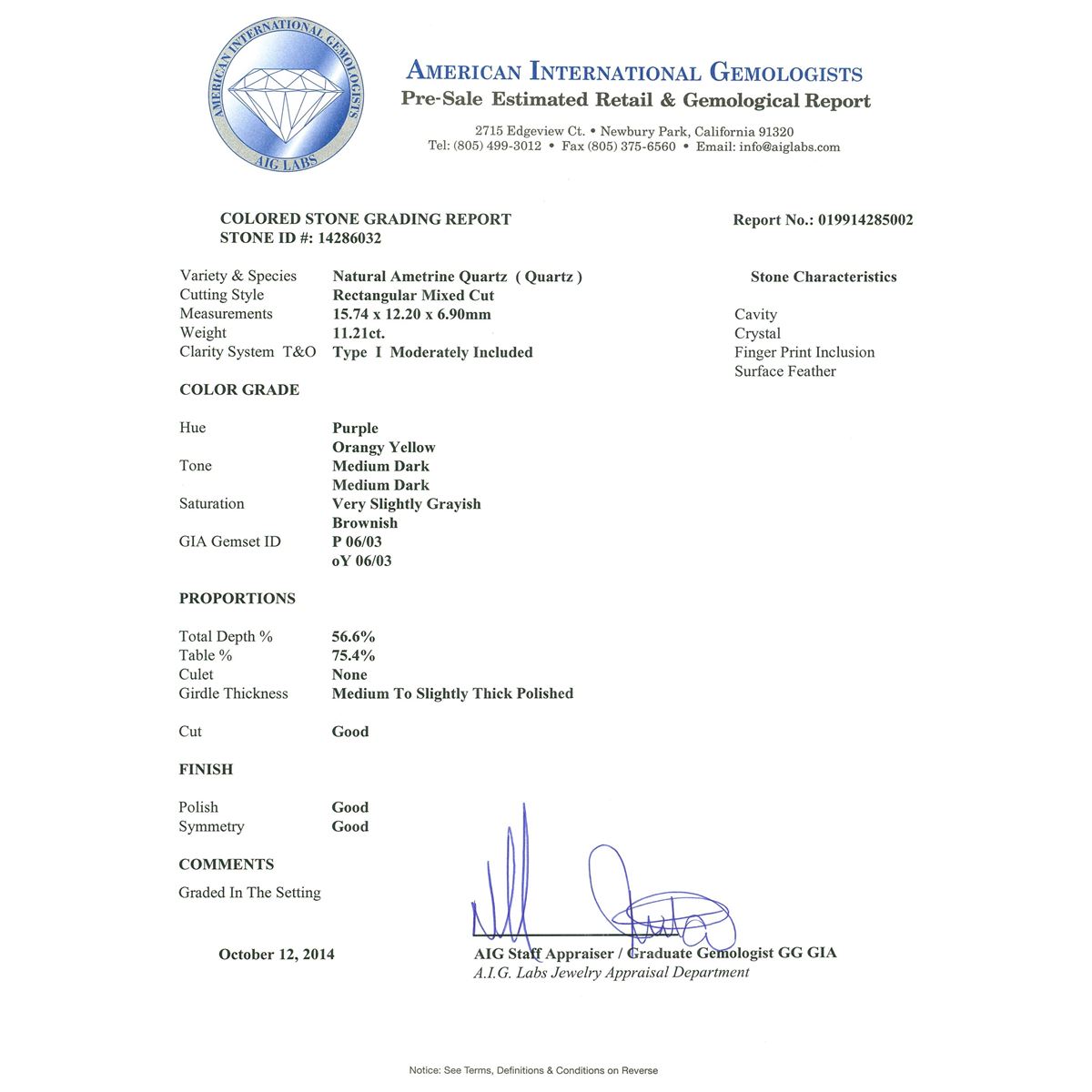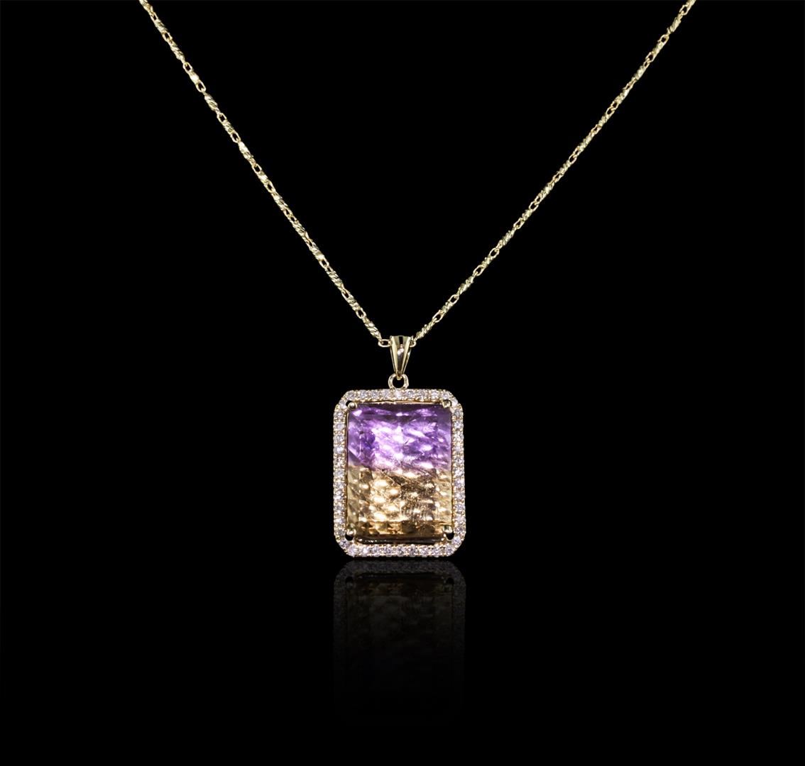 One electronically tested 14KT yellow gold ladies cast & assembled ametrine and diamond pendant with chain. The pendant features an ametrine set within a diamond bezel, completed by a yellow gold bail. The pendant is supported by an eighteen inch length 14KT yellow gold designer style chain, terminating in a lobster claw clasp. Bright polish finish. Identified with markings of "14K". Condition is new, good workmanship. Containing: One prong set rectangular mixed cut natural ametrine quartz, measuring 15.74 x 12.20 x 6.90mm, 6% bulge factor, approximate weight of 11.21ct., clarity is moderately included, type I, medium dark, very slightly grayish, purple color, (GIA P 6/3) to medium dark, brownish, orangy yellow, (GIA oY 6/3), cut is good. Transmitting light with a minimum of distortion, transparent. Naturally occurring internal & external characteristics are present. Colored Stone Grading Report attached. Graded in the setting. Forty-Four prong set round brilliant cut diamonds, measuring 1.30 - 1.20 x 0.75mm (depth est.) approximate total weight of 44 Stones = 0.41ct. Graded in the setting. Clarity: SI-2 to I-2. Color: G - I. Total Weight of Colored Stones 11.21ct. Total Weight of Diamonds 0.41ct. Total Weight of Pendant With Chain 8.03 grams. AIG Appraised at $2,580.00.