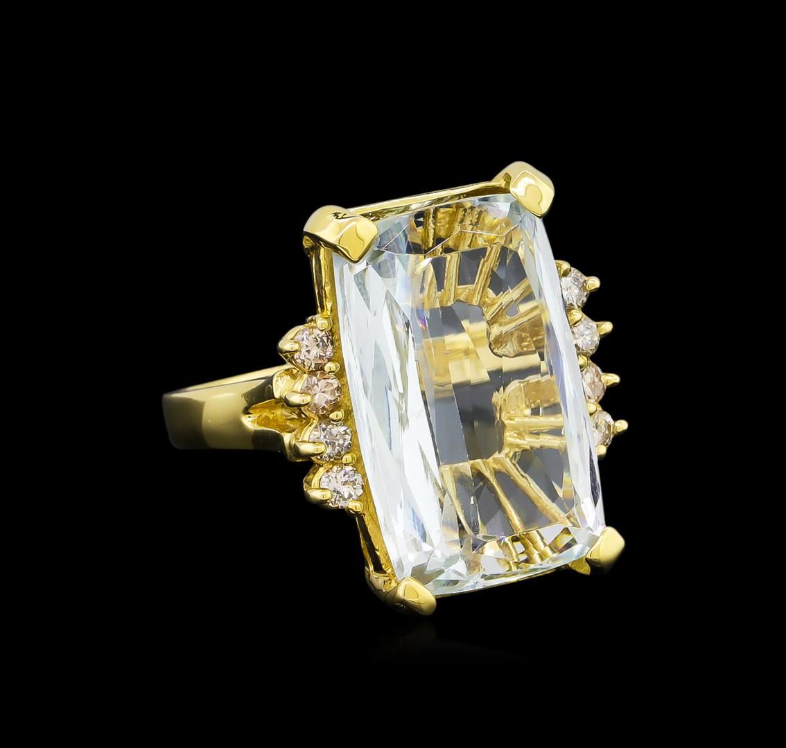 One electronically tested 14KT yellow gold ladies cast aquamarine and diamond ring with a bright polish finish. Condition is new, good workmanship. The featured aquamarine is supported by diamond accented shoulders, completed by a two and one-half millimeter wide band. Identified with markings of "14K". Containing: One prong set rectangular cushion mixed cut natural aquamarine, measuring 18.80 x 12.00 x 7.10mm, 10% bulge factor, approximate weight of 11.26ct, clarity is slightly included, type I, medium light, very slightly grayish, very slightly greenish blue color (GIA vslgB 4/3) cut is good. Transmitting light with a minimum of distortion, transparent. Naturally ocurring internal and external characteristics are present. Colored Stone Grading Report attached. Graded in the setting. Eight prong set round brilliant cut diamonds, measuring 2.20 - 2.10 x 1.29mm (depth est) approximate total weight of 8 stones = 0.39ct. Graded in the setting. Clarity SI-2 to I-1. Color H-J. Total weight of colored stones 11.26ct. Total weight of diamonds 0.39ct. Total weight of ring 9.41 grams. AIG Appraised at $7,095.00.