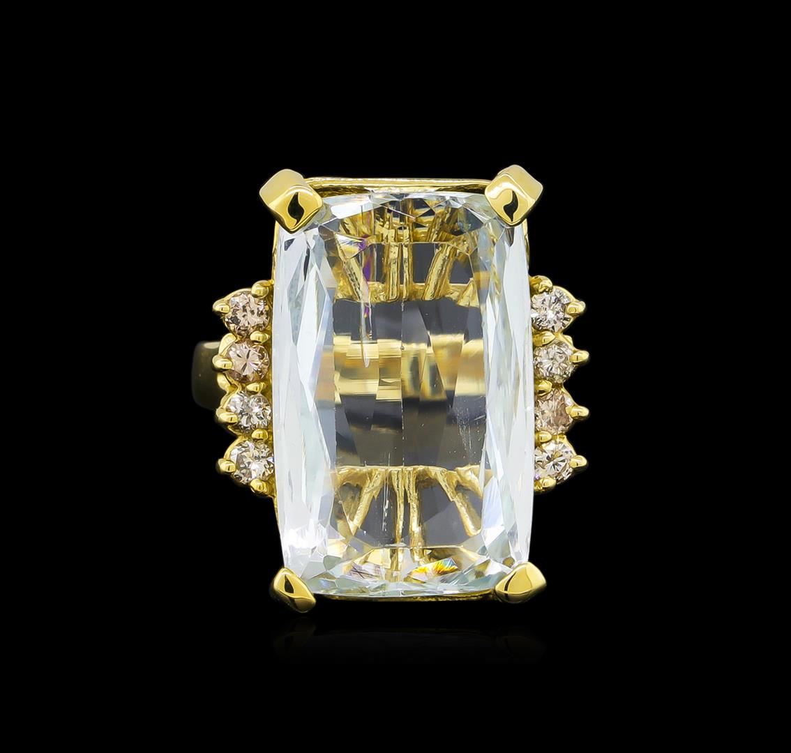 One electronically tested 14KT yellow gold ladies cast aquamarine and diamond ring with a bright polish finish. Condition is new, good workmanship. The featured aquamarine is supported by diamond accented shoulders, completed by a two and one-half millimeter wide band. Identified with markings of "14K". Containing: One prong set rectangular cushion mixed cut natural aquamarine, measuring 18.80 x 12.00 x 7.10mm, 10% bulge factor, approximate weight of 11.26ct, clarity is slightly included, type I, medium light, very slightly grayish, very slightly greenish blue color (GIA vslgB 4/3) cut is good. Transmitting light with a minimum of distortion, transparent. Naturally ocurring internal and external characteristics are present. Colored Stone Grading Report attached. Graded in the setting. Eight prong set round brilliant cut diamonds, measuring 2.20 - 2.10 x 1.29mm (depth est) approximate total weight of 8 stones = 0.39ct. Graded in the setting. Clarity SI-2 to I-1. Color H-J. Total weight of colored stones 11.26ct. Total weight of diamonds 0.39ct. Total weight of ring 9.41 grams. AIG Appraised at $7,095.00.
