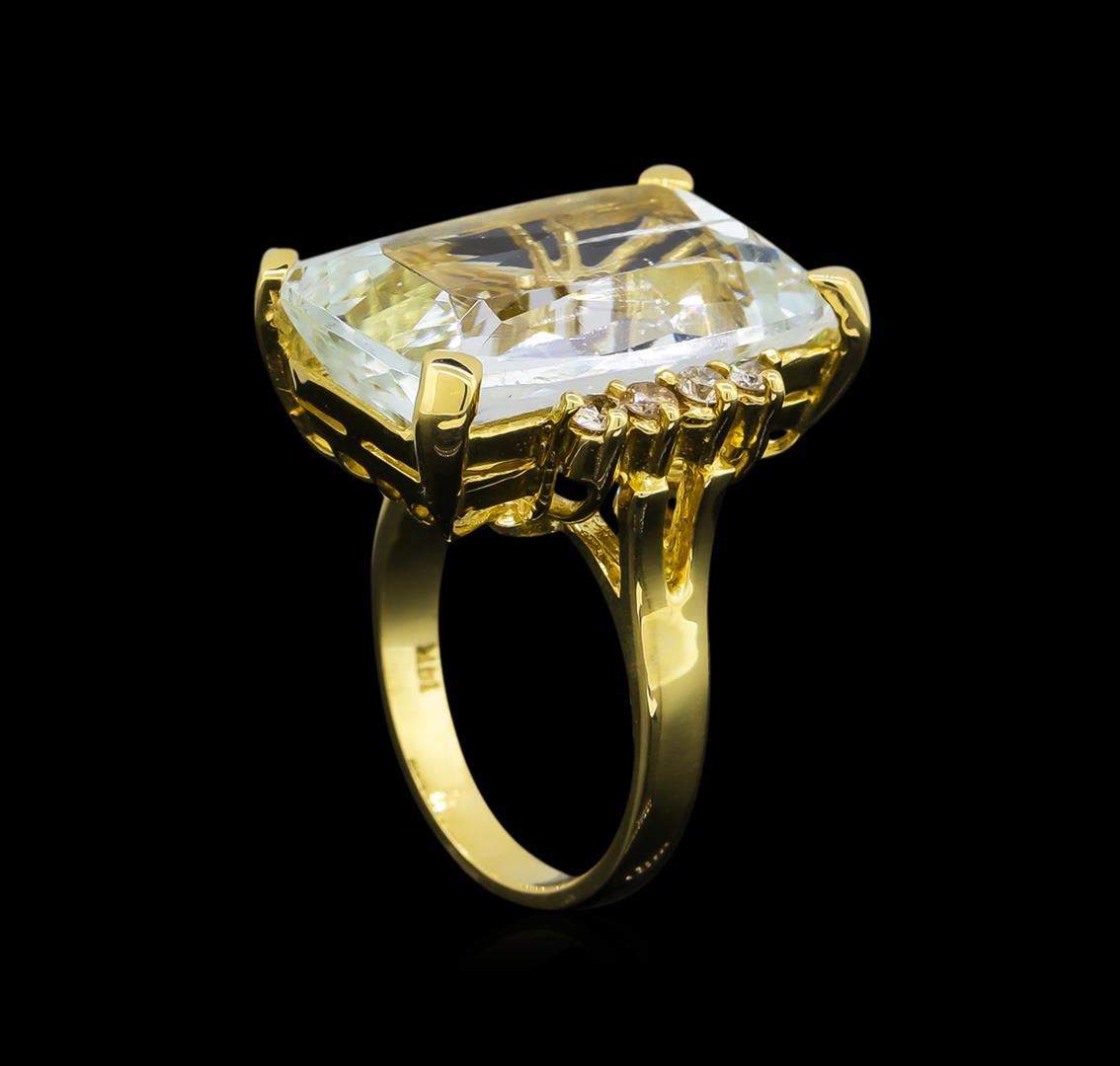 One electronically tested 14KT yellow gold ladies cast aquamarine and diamond ring with a bright polish finish. Condition is new, good workmanship. The featured aquamarine is supported by diamond accented shoulders, completed by a two and one-half millimeter wide band. Identified with markings of "14K". Containing: One prong set rectangular cushion mixed cut natural aquamarine, measuring 18.80 x 12.00 x 7.10mm, 10% bulge factor, approximate weight of 11.26ct, clarity is slightly included, type I, medium light, very slightly grayish, very slightly greenish blue color (GIA vslgB 4/3) cut is good. Transmitting light with a minimum of distortion, transparent. Naturally ocurring internal and external characteristics are present. Colored Stone Grading Report attached. Graded in the setting. Eight prong set round brilliant cut diamonds, measuring 2.20 - 2.10 x 1.29mm (depth est) approximate total weight of 8 stones = 0.39ct. Graded in the setting. Clarity SI-2 to I-1. Color H-J. Total weight of colored stones 11.26ct. Total weight of diamonds 0.39ct. Total weight of ring 9.41 grams. AIG Appraised at $7,095.00.