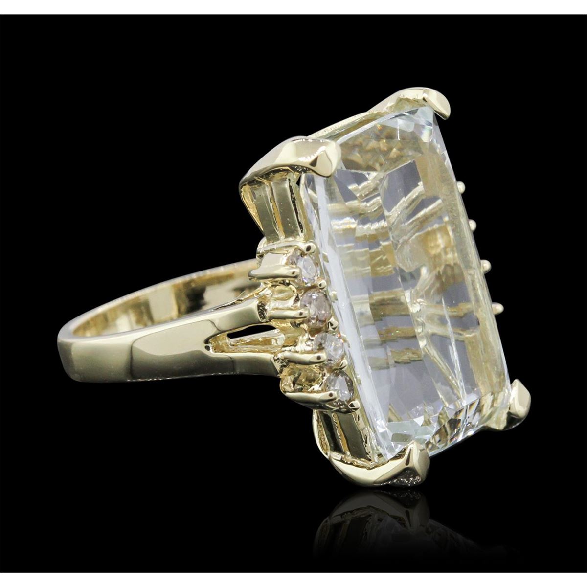 One electronically tested 14KT yellow gold ladies cast aquamarine and diamond ring with a bright polish finish. Condition is new, good workmanship. The featured aquamarine is supported by diamond accented shoulders, completed by a two and one-half millimeter wide band. Identified with markings of "14K". Containing: One prong set rectangular cushion mixed cut natural aquamarine, measuring 18.80 x 12.00 x 7.10mm, 10% bulge factor, approximate weight of 11.26ct, clarity is slightly included, type I, medium light, very slightly grayish, very slightly greenish blue color (GIA vslgB 4/3) cut is good. Transmitting light with a minimum of distortion, transparent. Naturally ocurring internal and external characteristics are present. Colored Stone Grading Report attached. Graded in the setting. Eight prong set round brilliant cut diamonds, measuring 2.20 - 2.10 x 1.29mm (depth est) approximate total weight of 8 stones = 0.39ct. Graded in the setting. Clarity SI-2 to I-1. Color H-J. Total weight of colored stones 11.26ct. Total weight of diamonds 0.39ct. Total weight of ring 9.41 grams. AIG Appraised at $7,095.00.