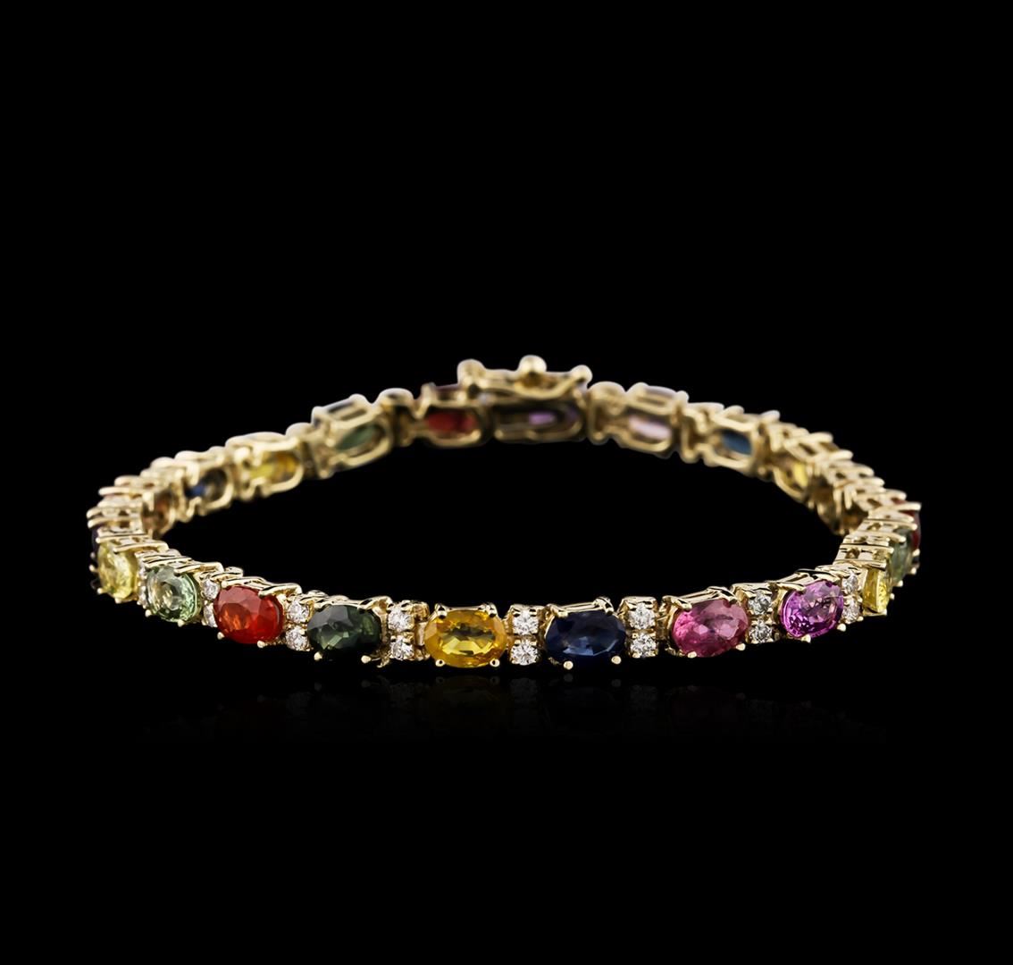 One electronically tested 14KT yellow gold ladies cast sapphire and diamond bracelet with a hidden box clasp with safety closer with a bright polish finish. Measurements: 7.25" in length Identified with markings of "14K". Condition is new. Containing: Twenty-two prong set oval modified brilliant multi color sapphires, measuring 6.00 x 4.00 x 2.60mm, approximate total weight of 11.44ct., clarity is moderately included, type II, medium light, very slightly grayish, violet color, (GIA V 4/3), cut is good. Forty-Four prong set round brilliant cut diamonds, measuring 1.90 - 1.90 x 1.14mm (depth est.) approximate total weight of 44 Stones = 1.10ct. Clarity of SI-1 to SI-2, Color of I - J, Cut is Good. Colored gemstones are presumed to have been subjected to commonly used enhancement processes. All diamonds and colored gemstones are graded in the mounting, unless otherwise stated. Total Weight of Colored Stones 11.44ct. Total Weight of Diamonds 1.10ct. Total Weight of Bracelet 14.10 grams. GGL Appraised at $5,935.00.