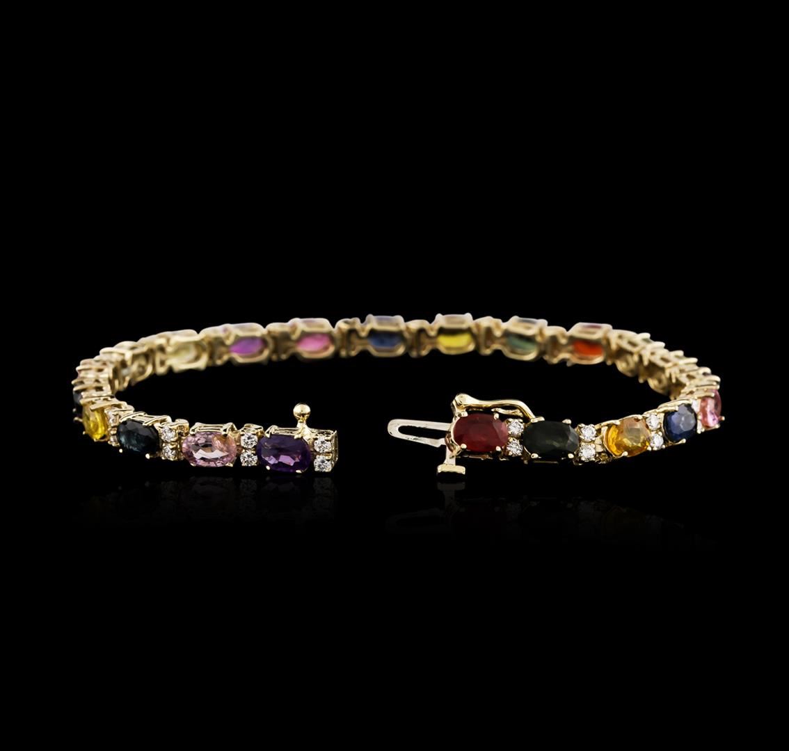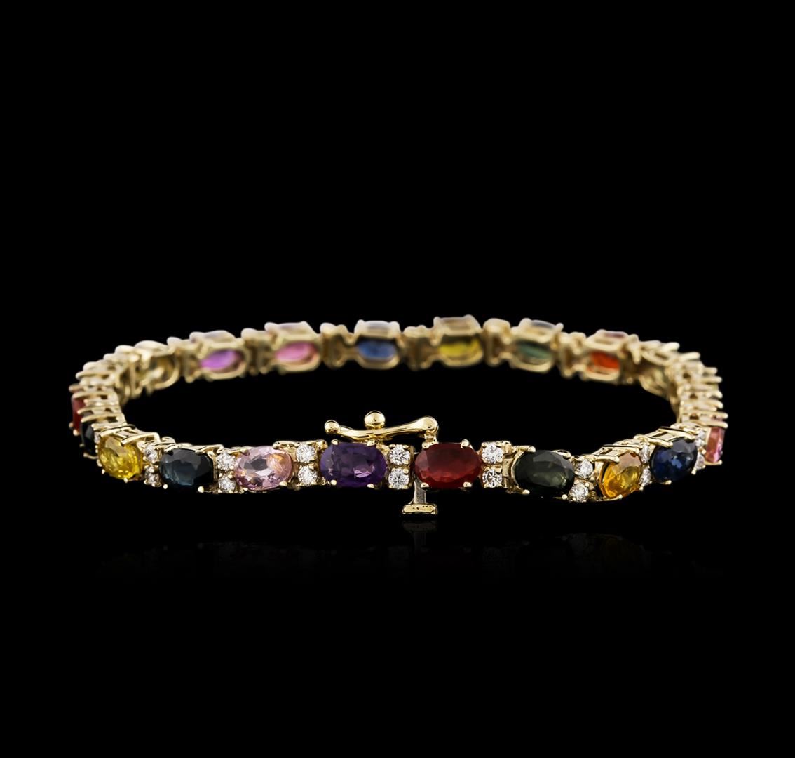 One electronically tested 14KT yellow gold ladies cast sapphire and diamond bracelet with a hidden box clasp with safety closer with a bright polish finish. Measurements: 7.25" in length Identified with markings of "14K". Condition is new. Containing: Twenty-two prong set oval modified brilliant multi color sapphires, measuring 6.00 x 4.00 x 2.60mm, approximate total weight of 11.44ct., clarity is moderately included, type II, medium light, very slightly grayish, violet color, (GIA V 4/3), cut is good. Forty-Four prong set round brilliant cut diamonds, measuring 1.90 - 1.90 x 1.14mm (depth est.) approximate total weight of 44 Stones = 1.10ct. Clarity of SI-1 to SI-2, Color of I - J, Cut is Good. Colored gemstones are presumed to have been subjected to commonly used enhancement processes. All diamonds and colored gemstones are graded in the mounting, unless otherwise stated. Total Weight of Colored Stones 11.44ct. Total Weight of Diamonds 1.10ct. Total Weight of Bracelet 14.10 grams. GGL Appraised at $5,935.00.