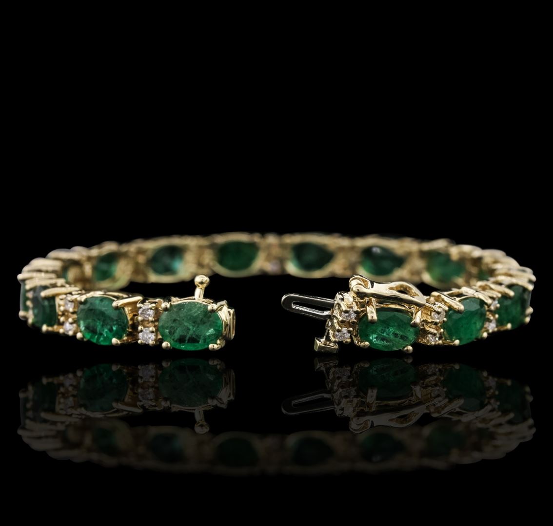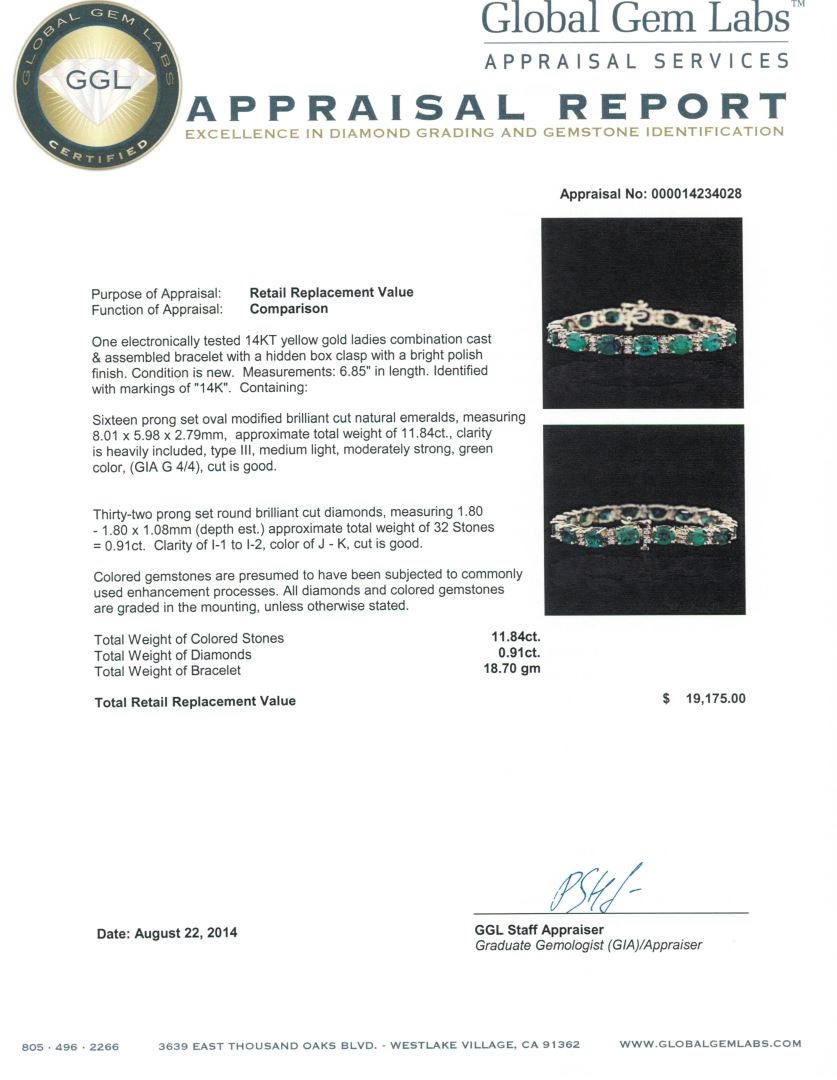 One electronically tested 14KT yellow gold ladies combination cast & assembled bracelet with a hidden box clasp with a bright polish finish. Measurements: 6.85" in length. Identified with markings of "14K". Condition is new. Containing: Sixteen prong set oval modified brilliant cut natural emeralds, measuring 8.01 x 5.98 x 2.79mm, approximate total weight of 11.84ct., clarity is heavily included, type III, medium light, moderately strong, green color, (GIA G 4/4), cut is good. Thirty-Two prong set round brilliant cut diamonds, measuring 1.80 - 1.80 x 1.08mm (depth est.) approximate total weight of 32 Stones = 0.91ct. Clarity: I-1 to I-2. Color: J - K, Cut is Good. Colored gemstones are presumed to have been subjected to commonly used enhancement processes. All diamonds and colored gemstones are graded in the mounting, unless otherwise stated. Total Weight of Colored Stones 11.84ct. Total Weight of Diamonds 0.91ct. Total Weight of Bracelet 18.70 grams. GGL Appraised at $19,175.00.