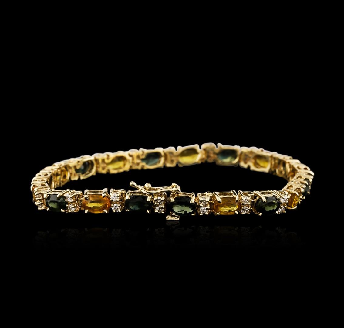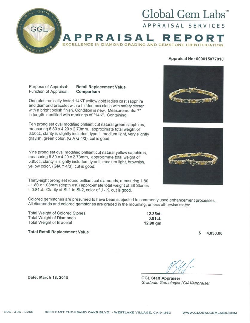 One electronically tested 14KT yellow gold ladies cast sapphire and diamond bracelet with a hidden box clasp with safety closer with a bright polish finish. Measurements: 7" in length Identified with markings of "14K". Condition is new. Containing: Ten prong set oval modified brilliant cut natural green sapphires, measuring 6.80 x 4.20 x 2.73mm, approximate total weight of 6.50ct., clarity is slightly included, type II, medium light, very slightly grayish, green color, (GIA G 4/3), cut is good. Nine prong set oval modified brilliant cut natural yellow sapphires, measuring 6.80 x 4.20 x 2.73mm, approximate total weight of 5.85ct., clarity is slightly included, type II, medium light, brownish, yellow color, (GIA Y 4/3), cut is good. Thirty-Eight prong set round brilliant cut diamonds, measuring 1.80 - 1.80 x 1.08mm (depth est.) approximate total weight of 38 Stones = 0.81ct. Clarity of SI-1 to SI-2, Color of J - K, Cut is Good. Colored gemstones are presumed to have been subjected to commonly used enhancement processes. All diamonds and colored gemstones are graded in the mounting, unless otherwise stated. Total Weight of Colored Stones 12.35ct. Total Weight of Diamonds 0.81ct. Total Weight of Bracelet 12.90 grams. GGL Appraised at $4,830.00.