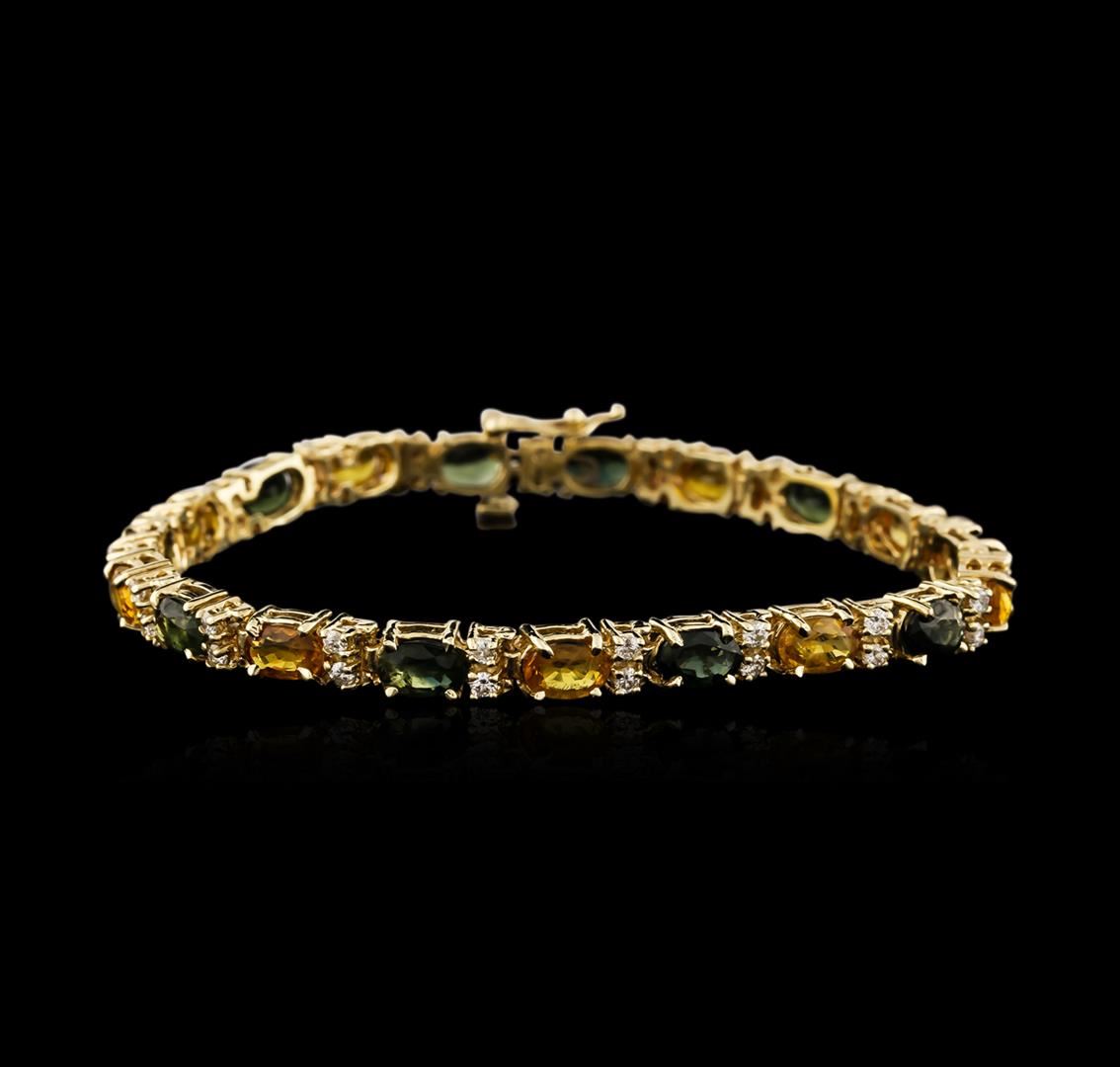 One electronically tested 14KT yellow gold ladies cast sapphire and diamond bracelet with a hidden box clasp with safety closer with a bright polish finish. Measurements: 7" in length Identified with markings of "14K". Condition is new. Containing: Ten prong set oval modified brilliant cut natural green sapphires, measuring 6.80 x 4.20 x 2.73mm, approximate total weight of 6.50ct., clarity is slightly included, type II, medium light, very slightly grayish, green color, (GIA G 4/3), cut is good. Nine prong set oval modified brilliant cut natural yellow sapphires, measuring 6.80 x 4.20 x 2.73mm, approximate total weight of 5.85ct., clarity is slightly included, type II, medium light, brownish, yellow color, (GIA Y 4/3), cut is good. Thirty-Eight prong set round brilliant cut diamonds, measuring 1.80 - 1.80 x 1.08mm (depth est.) approximate total weight of 38 Stones = 0.81ct. Clarity of SI-1 to SI-2, Color of J - K, Cut is Good. Colored gemstones are presumed to have been subjected to commonly used enhancement processes. All diamonds and colored gemstones are graded in the mounting, unless otherwise stated. Total Weight of Colored Stones 12.35ct. Total Weight of Diamonds 0.81ct. Total Weight of Bracelet 12.90 grams. GGL Appraised at $4,830.00.