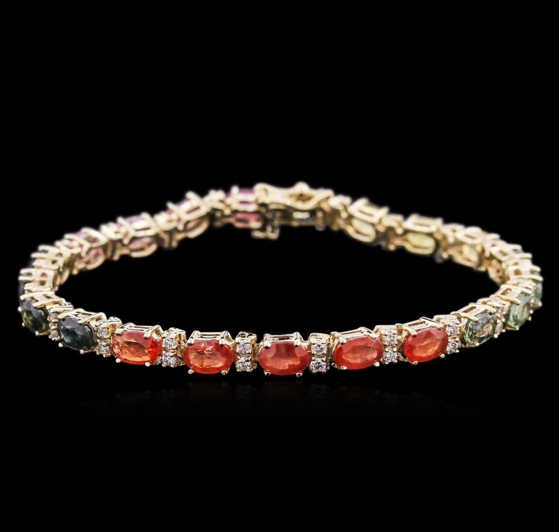 One stamped & tested 14KT yellow gold ladies cast sapphire and diamond bracelet with a hidden box clasp with a bright polish finish. Measurements: 7" in length Condition is new. Containing: Twenty-one prong set oval modified brilliant cut natural multicolor sapphires, measuring 5.90 x 4.30 x 2.81mm, approximate total weight of 12.50ct., clarity is slightly included, type II, medium, very slightly grayish, yellow, pink and blue color, (GIA V 5/3), cut is good. The stones have been treated to improve the color. Forty-Two prong set round brilliant cut diamonds, measuring 1.85 - 1.50 x 1.09mm (depth est.) approximate total weight of 42 Stones = 0.92ct. Clarity: SI-1 to I-1. Color: I - J, Cut is Good. Colored gemstones are presumed to have been subjected to commonly used enhancement processes. All diamonds and colored gemstones are graded in the mounting, unless otherwise stated. Total Weight of Colored Stones 12.50ct. Total Weight of Diamonds 0.92ct. Total Weight of Bracelet 13.10 grams. GGL Appraised at $5,355.00.