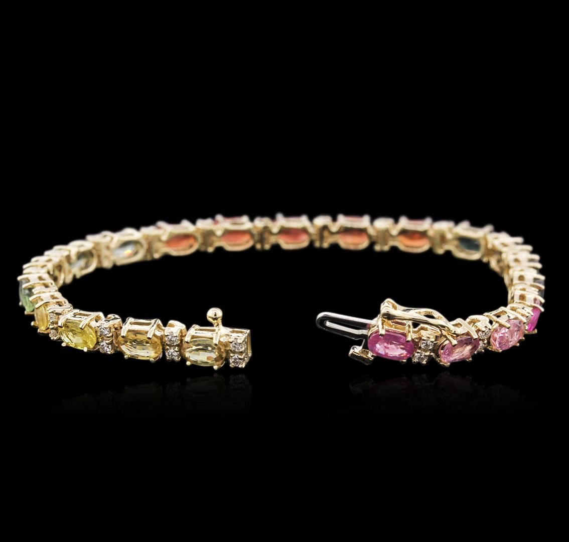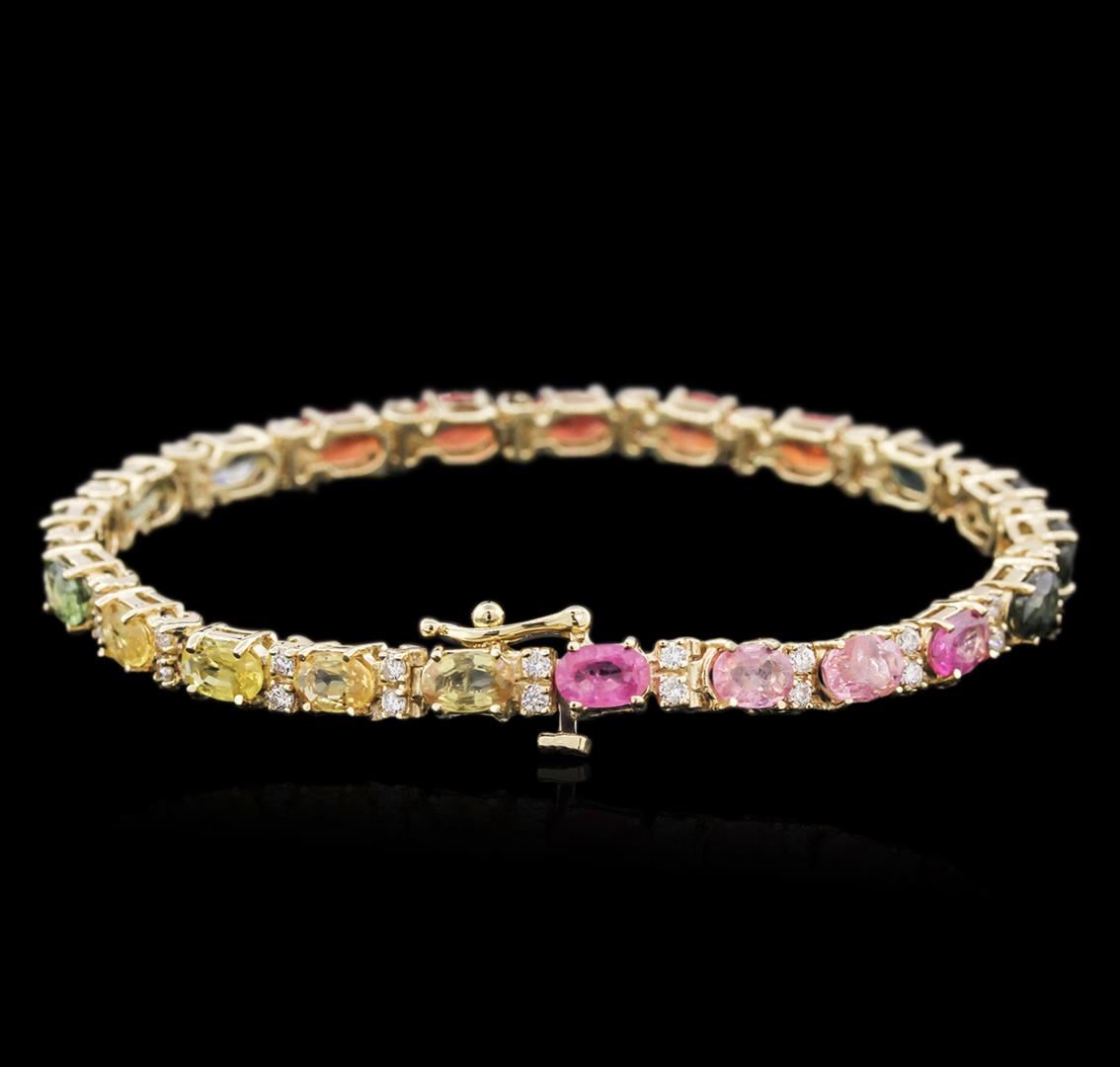 One stamped & tested 14KT yellow gold ladies cast sapphire and diamond bracelet with a hidden box clasp with a bright polish finish. Measurements: 7" in length Condition is new. Containing: Twenty-one prong set oval modified brilliant cut natural multicolor sapphires, measuring 5.90 x 4.30 x 2.81mm, approximate total weight of 12.50ct., clarity is slightly included, type II, medium, very slightly grayish, yellow, pink and blue color, (GIA V 5/3), cut is good. The stones have been treated to improve the color. Forty-Two prong set round brilliant cut diamonds, measuring 1.85 - 1.50 x 1.09mm (depth est.) approximate total weight of 42 Stones = 0.92ct. Clarity: SI-1 to I-1. Color: I - J, Cut is Good. Colored gemstones are presumed to have been subjected to commonly used enhancement processes. All diamonds and colored gemstones are graded in the mounting, unless otherwise stated. Total Weight of Colored Stones 12.50ct. Total Weight of Diamonds 0.92ct. Total Weight of Bracelet 13.10 grams. GGL Appraised at $5,355.00.