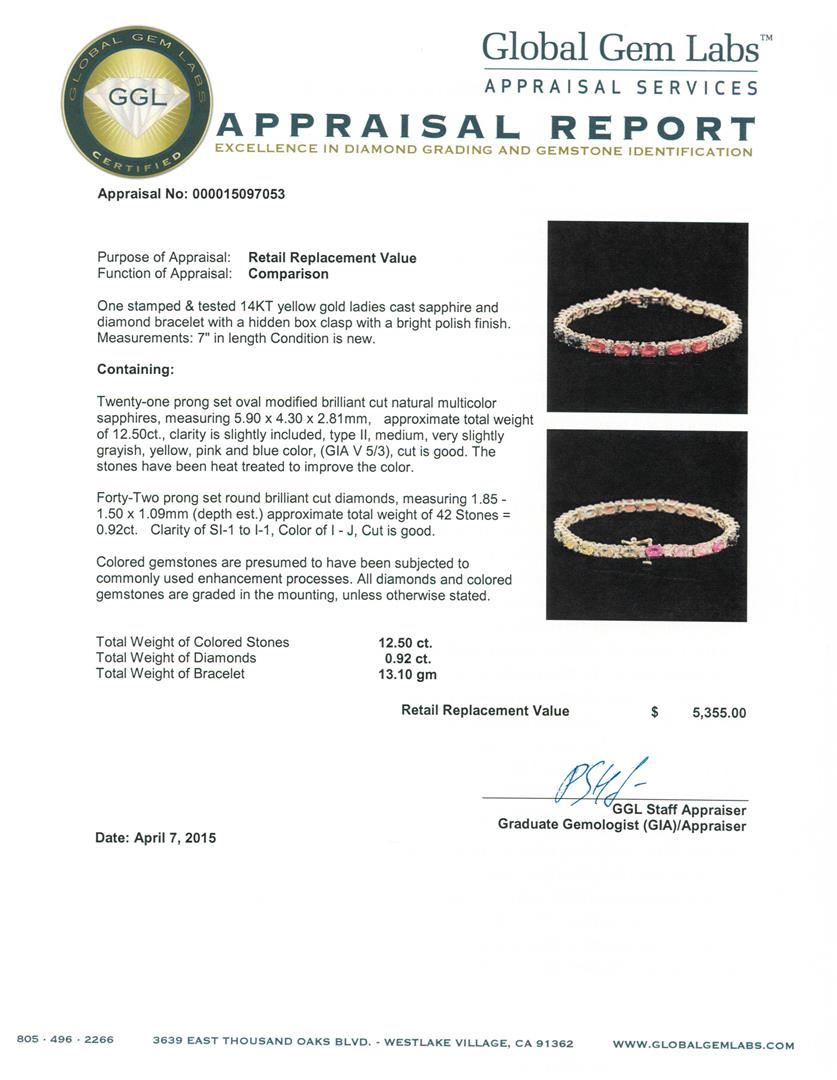 One stamped & tested 14KT yellow gold ladies cast sapphire and diamond bracelet with a hidden box clasp with a bright polish finish. Measurements: 7" in length Condition is new. Containing: Twenty-one prong set oval modified brilliant cut natural multicolor sapphires, measuring 5.90 x 4.30 x 2.81mm, approximate total weight of 12.50ct., clarity is slightly included, type II, medium, very slightly grayish, yellow, pink and blue color, (GIA V 5/3), cut is good. The stones have been treated to improve the color. Forty-Two prong set round brilliant cut diamonds, measuring 1.85 - 1.50 x 1.09mm (depth est.) approximate total weight of 42 Stones = 0.92ct. Clarity: SI-1 to I-1. Color: I - J, Cut is Good. Colored gemstones are presumed to have been subjected to commonly used enhancement processes. All diamonds and colored gemstones are graded in the mounting, unless otherwise stated. Total Weight of Colored Stones 12.50ct. Total Weight of Diamonds 0.92ct. Total Weight of Bracelet 13.10 grams. GGL Appraised at $5,355.00.