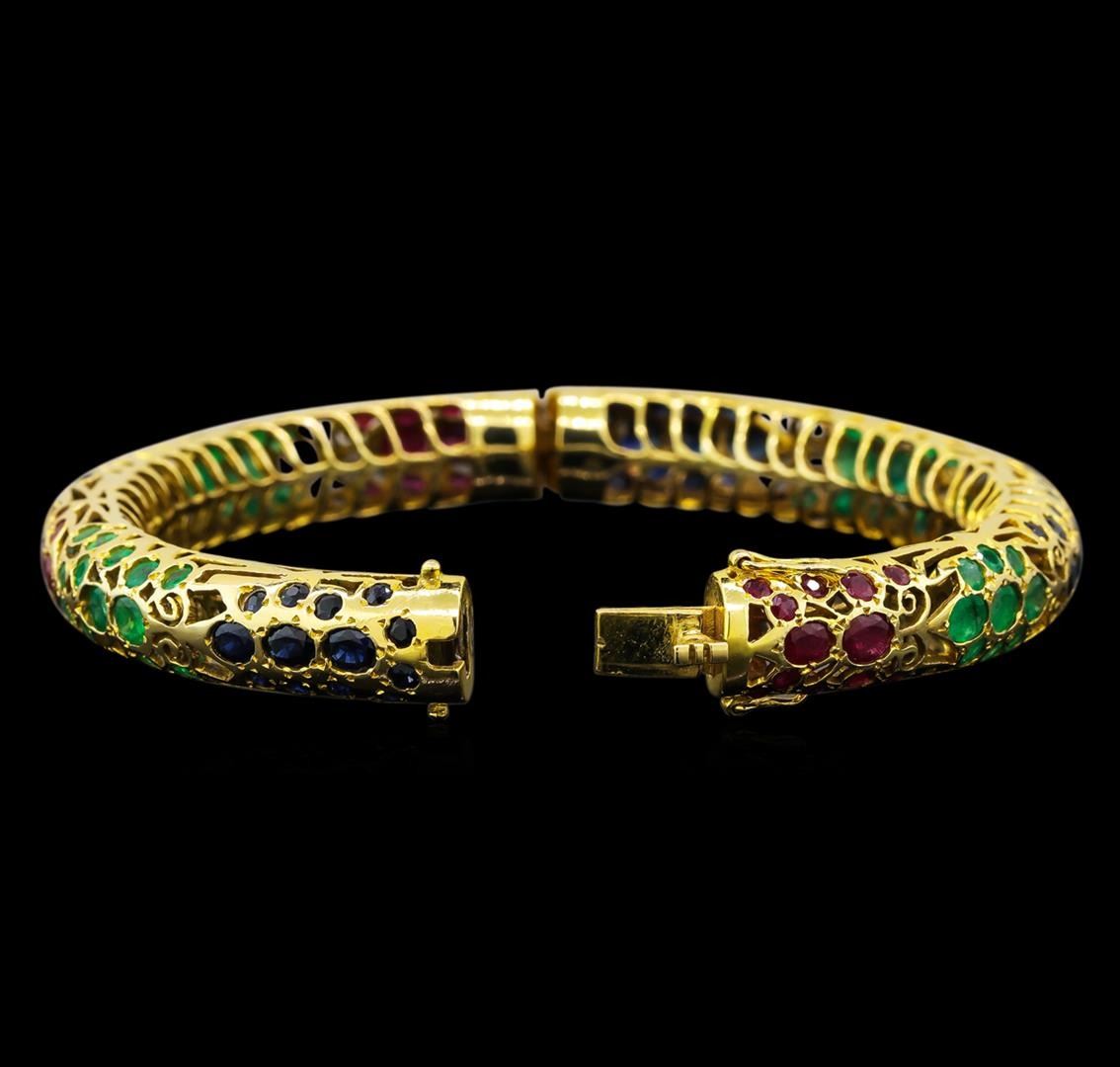 One electronically tested 14KT yellow gold ladies cast emerald, ruby and sapphire bangle bracelet with a hidden box clasp with a bright polish finish. Measurements: 2.5" in diameter Condition is very good. Containing: Forty-five prong set oval modified brilliant cut natural emeralds, measuring 6.00 x 4.00 x 2.60mm, approximate total weight of 16.20ct., clarity is heavily included, type III, medium light, moderately strong, green color, (GIA G 4/4), cut is good. Forty-two prong set oval modified brilliant cut natural rubies, measuring 6.00 x 4.00 x 2.60mm, approximate total weight of 22.26ct., clarity is heavily included, medium, moderately strong, purple red color, (GIA PR 5/4), cut is good. One prong set oval modified brilliant cut natural blue sapphire, measuring 6.00 x 4.00 x 2.60mm, approximate weight of 0.52ct., clarity is slightly included, type II, medium, moderately strong, blue color, (GIA B 5/4), cut is good. Colored gemstones are presumed to have been subjected to commonly used enhancement processes. All colored gemstones are graded in the mounting, unless otherwise stated. Total Weight of Colored Stones 38.98ct. Total Weight of Bangle Bracelet 28.20 grams. GGL Appraised at $7,245.00.
