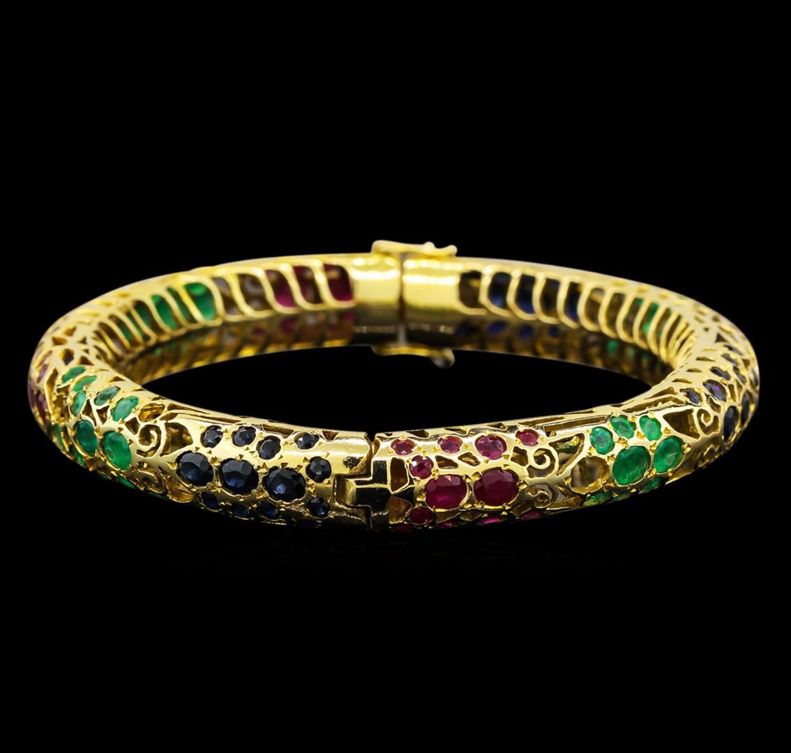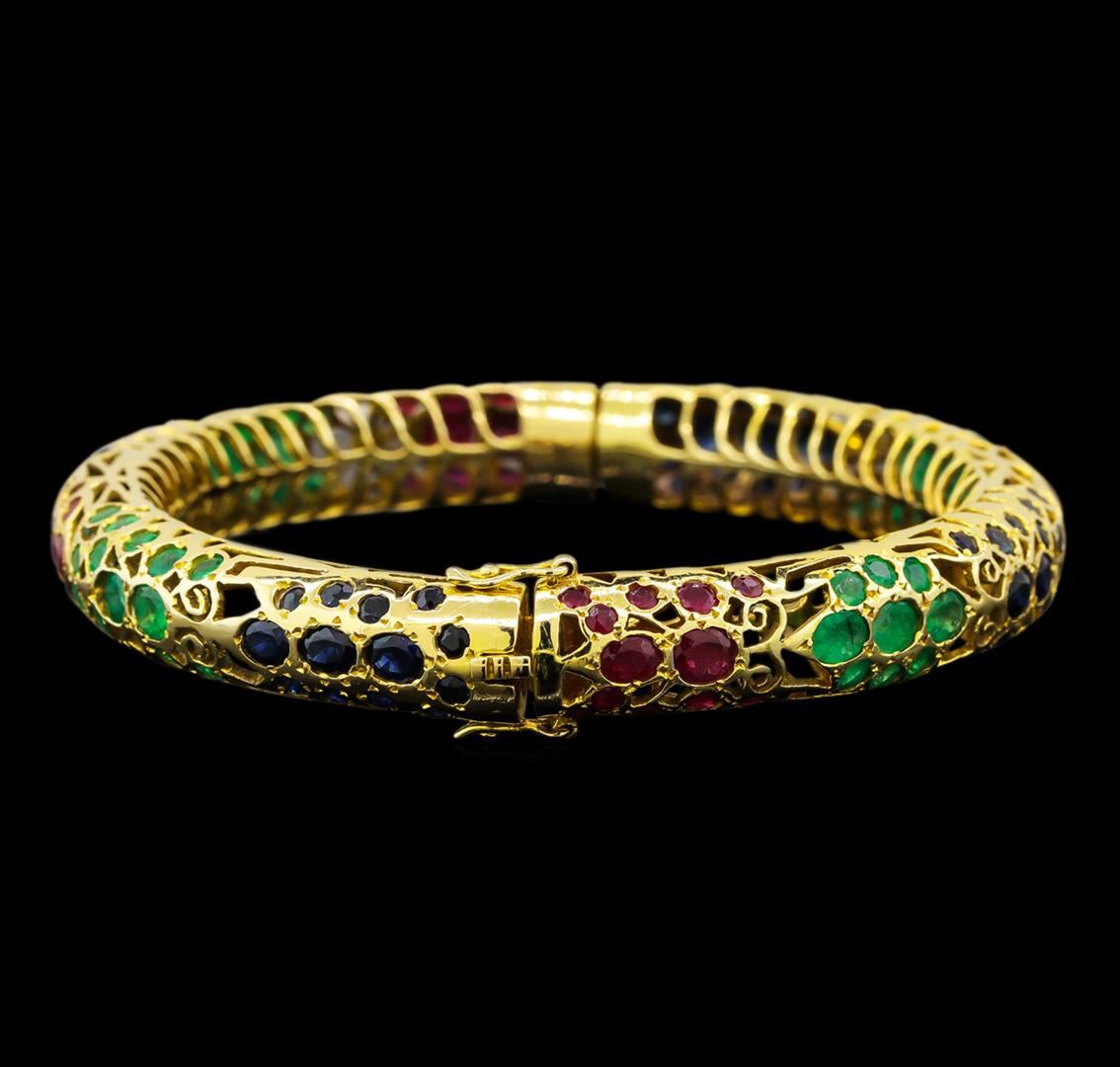 One electronically tested 14KT yellow gold ladies cast emerald, ruby and sapphire bangle bracelet with a hidden box clasp with a bright polish finish. Measurements: 2.5" in diameter Condition is very good. Containing: Forty-five prong set oval modified brilliant cut natural emeralds, measuring 6.00 x 4.00 x 2.60mm, approximate total weight of 16.20ct., clarity is heavily included, type III, medium light, moderately strong, green color, (GIA G 4/4), cut is good. Forty-two prong set oval modified brilliant cut natural rubies, measuring 6.00 x 4.00 x 2.60mm, approximate total weight of 22.26ct., clarity is heavily included, medium, moderately strong, purple red color, (GIA PR 5/4), cut is good. One prong set oval modified brilliant cut natural blue sapphire, measuring 6.00 x 4.00 x 2.60mm, approximate weight of 0.52ct., clarity is slightly included, type II, medium, moderately strong, blue color, (GIA B 5/4), cut is good. Colored gemstones are presumed to have been subjected to commonly used enhancement processes. All colored gemstones are graded in the mounting, unless otherwise stated. Total Weight of Colored Stones 38.98ct. Total Weight of Bangle Bracelet 28.20 grams. GGL Appraised at $7,245.00.