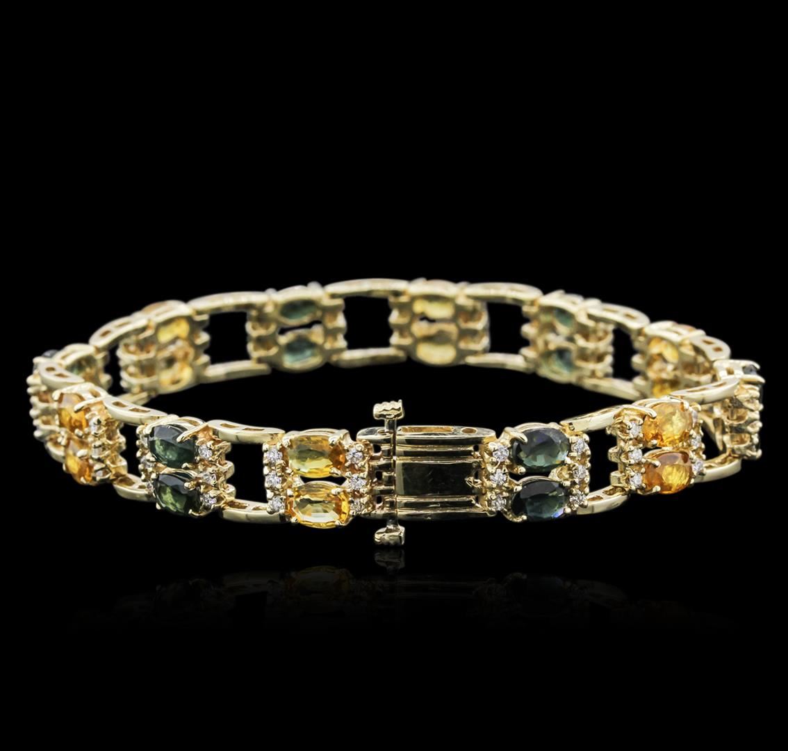 One electronically tested 14KT yellow gold ladies cast sapphire and diamond bracelet with a hidden box clasp with a bright polish finish. Measurements: 7 inches in length. Condition is new. Containing: Twelve prong set oval modified brilliant cut natural green sapphires, measuring 6.00. x 4.00. x 2.60mm, approximate total weight of 6.48ct., clarity is moderately included, medium light, very slightly grayish, bluish green color, (GIA bG 4/3), cut is good. Twelve prong set oval modified brilliant cut natural yellow sapphires, measuring 6.00. x 4.00. x 2.60mm, approximate total weight of 6.49ct., clarity is moderately included, type II, medium light, brownish, yellow color, (GIA Y 4/3), cut is good. Seventy-Two prong set round brilliant cut diamonds, measuring 1.50 - 1.50 x 0.90mm (depth est.) approximate total weight of 72 Stones = 1.08ct. Clarity: SI-1. Color: J - K, Cut is Good. Colored gemstones are presumed to have been subjected to commonly used enhancement processes. All diamonds and colored gemstones are graded in the mounting, unless otherwise stated. Total Weight of Colored Stones 12.97ct. Total Weight of Diamonds 1.08ct. Total Weight of Bracelet 24.80 grams. GGL Appraised at $4,350.00.