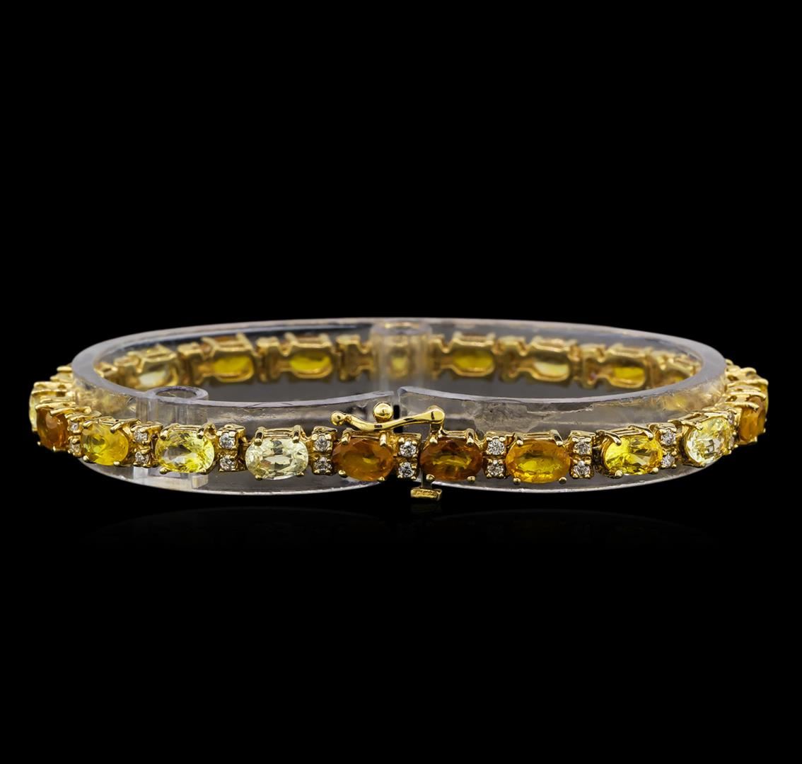 One electronically tested 14KT yellow gold ladies cast sapphire and diamond bracelet with a hidden box clasp with safety closer with a bright polish finish. Measurements: 7" in length. Identified with markings of "14K". Condition is new. Containing: Twenty-one prong set oval modified brilliant cut natural yellow sapphires, measuring 6.50 x 4.20 x 2.73mm, approximate total weight of 13.23ct., clarity is slightly included, type II, medium light, brownish, yellow color, (GIA Y 4/3), cut is good. Forty-Two prong set round brilliant cut diamonds, measuring 1.30 - 1.30 x 0.78mm (depth est.) approximate total weight of 42 Stones = 0.34ct. Clarity: SI-1 to SI-2. Color: J - K, Cut is Good. Colored gemstones are presumed to have been subjected to commonly used enhancement processes. All diamonds and colored gemstones are graded in the mounting, unless otherwise stated. Total Weight of Colored Stones 13.23ct. Total Weight of Diamonds 0.34ct. Total Weight of Bracelet 13.40 grams. GGL Appraised at $3,870.00.