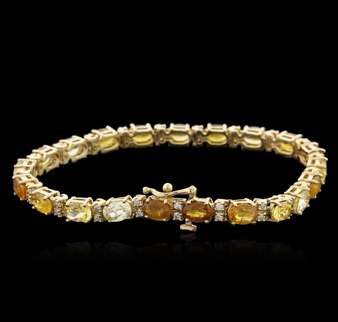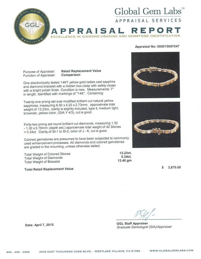 One electronically tested 14KT yellow gold ladies cast sapphire and diamond bracelet with a hidden box clasp with safety closer with a bright polish finish. Measurements: 7" in length. Identified with markings of "14K". Condition is new. Containing: Twenty-one prong set oval modified brilliant cut natural yellow sapphires, measuring 6.50 x 4.20 x 2.73mm, approximate total weight of 13.23ct., clarity is slightly included, type II, medium light, brownish, yellow color, (GIA Y 4/3), cut is good. Forty-Two prong set round brilliant cut diamonds, measuring 1.30 - 1.30 x 0.78mm (depth est.) approximate total weight of 42 Stones = 0.34ct. Clarity: SI-1 to SI-2. Color: J - K, Cut is Good. Colored gemstones are presumed to have been subjected to commonly used enhancement processes. All diamonds and colored gemstones are graded in the mounting, unless otherwise stated. Total Weight of Colored Stones 13.23ct. Total Weight of Diamonds 0.34ct. Total Weight of Bracelet 13.40 grams. GGL Appraised at $3,870.00.