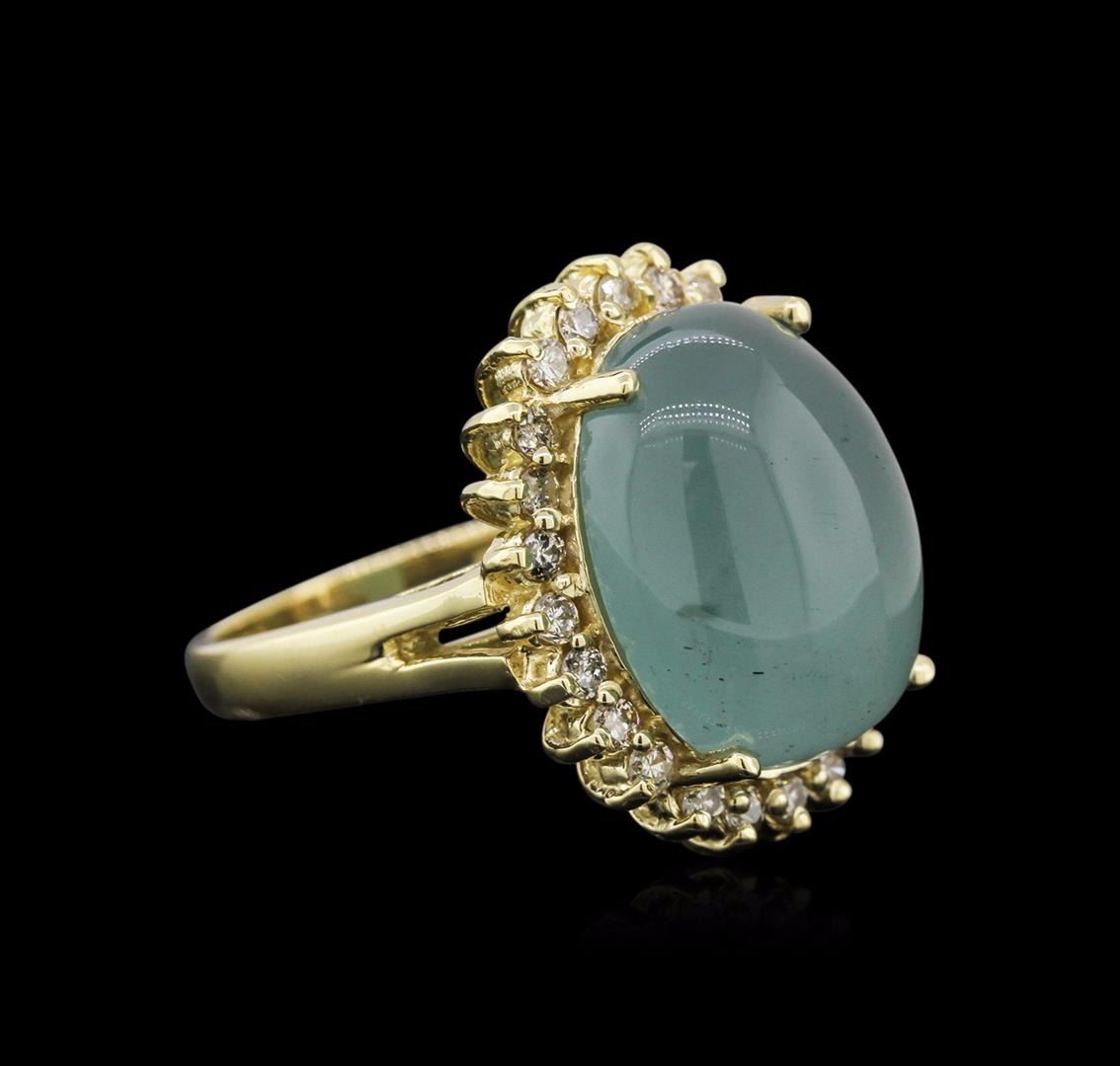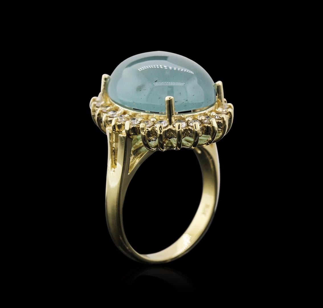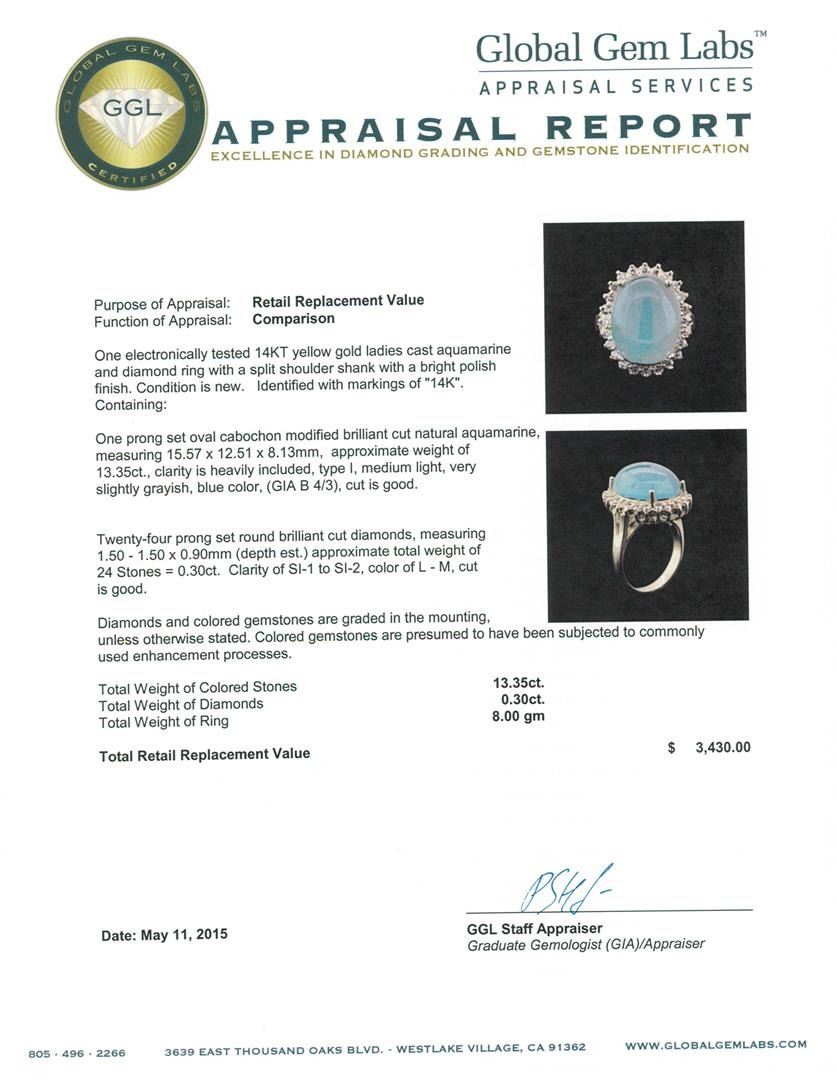 One electronically tested 14KT yellow gold ladies cast aquamarine and diamond ring with a split shoulder shank with a bright polish finish. Identified with markings of "14K". Condition is new. Containing: One prong set oval cabochon modified brilliant cut natural aquamarine, measuring 15.57 x 12.51 x 8.13mm, approximate weight of 13.35ct., clarity is heavily included, type I, medium light, very slightly grayish, blue color, (GIA B 4/3), cut is good. Twenty-Four prong set round brilliant cut diamonds, measuring 1.50 - 1.50 x 0.90mm (depth est.) approximate total weight of 24 Stones = 0.30ct. Clarity: SI-1 to SI-2. Color: L - M, Cut is Good. Diamonds and colored gemstones are graded in the mounting, unless otherwise stated. Colored gemstones are presumed to have been subjected to commonly used enhancement processes. Total Weight of Colored Stones 13.35ct. Total Weight of Diamonds 0.30ct. Total Weight of Ring 8.00 grams. GGL Appraised at $3,430.00.