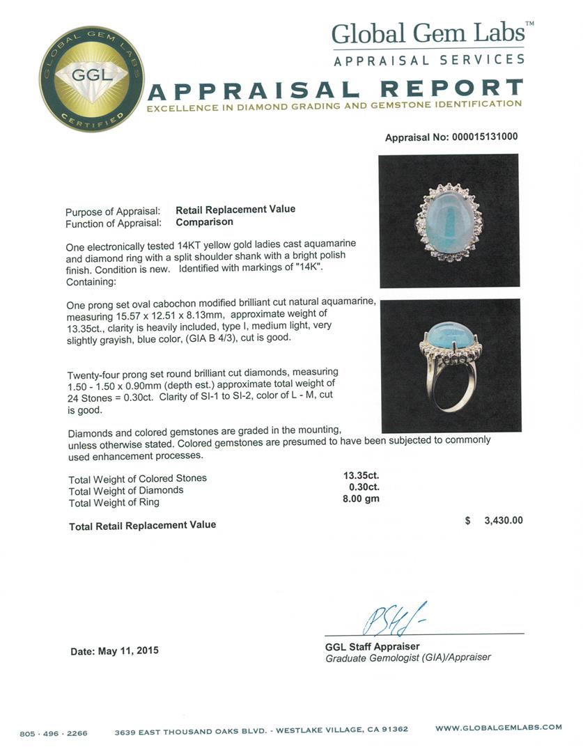 One electronically tested 14KT yellow gold ladies cast aquamarine and diamond ring with a split shoulder shank with a bright polish finish. Identified with markings of "14K". Condition is new. Containing: One prong set oval cabochon modified brilliant cut GGL Appraised at $3,430.00.