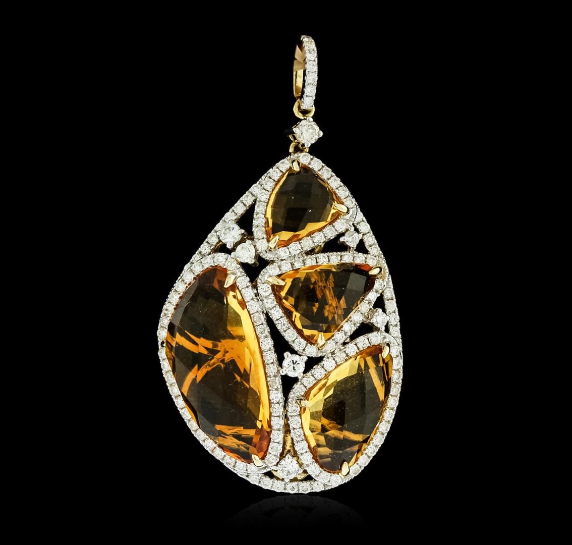 One pendant featuring: 14KT yellow gold weighing 6.00 grams containing citrine weighing a total of 13.38 carats and diamonds weighing a total of 1.36 carats.