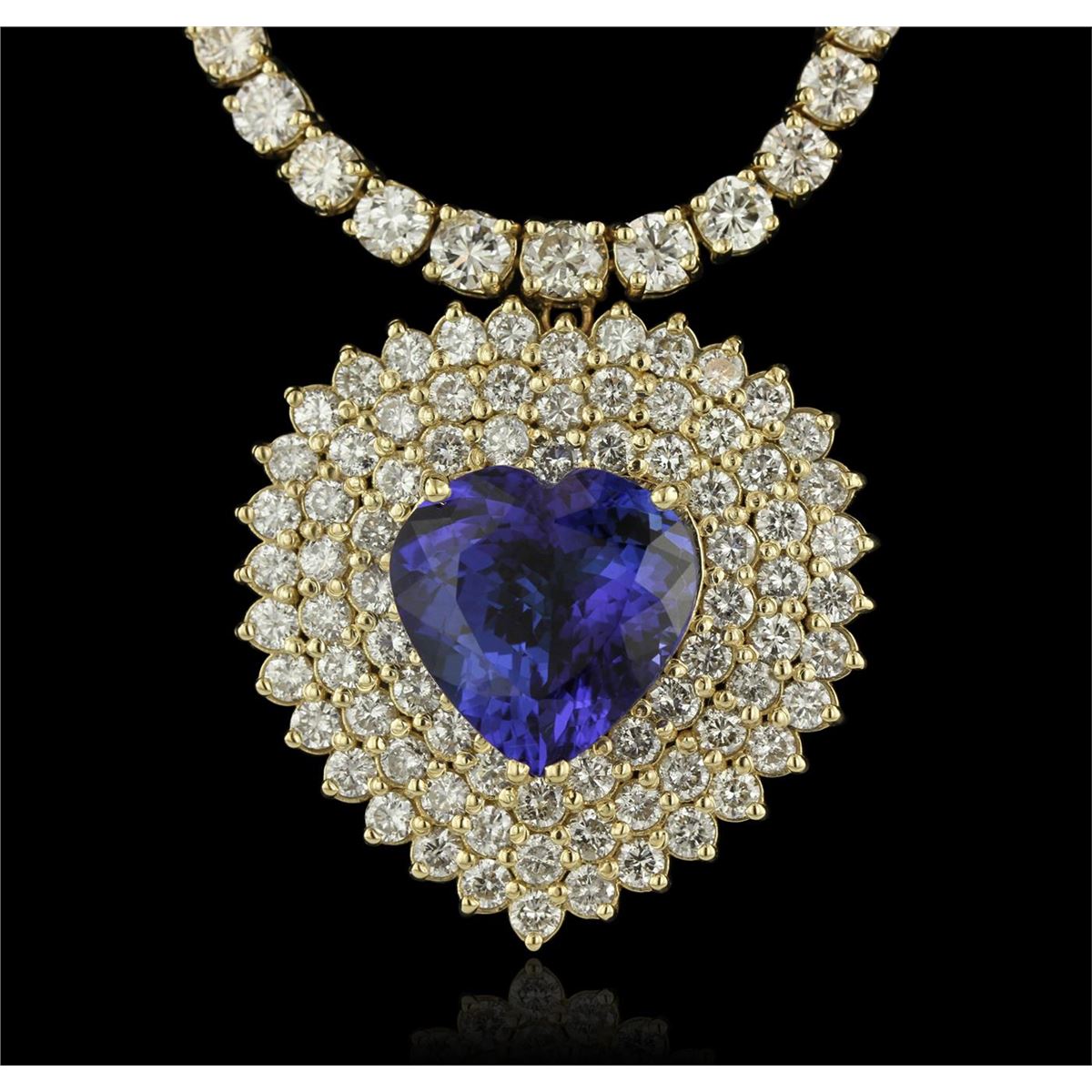 One electronically tested 14KT yellow gold Ladies combination cast & assembled necklace with a hidden box clasp with a bright polish finish. Condition is new. Measurements: 16" in length. Identified with markings of "14K". Containing: One prong set heart modified brilliant cut natural tanzanite, measuring 16.06 x 15.93 x 8.68mm, exact weight 13.62ct., clarity is eye clean, type I, medium, moderately strong, bluish violet color, (GIA bV 5/4), cut is very good. GIA Report: 1156961713. One Hundred Seventy-Nine prong set round brilliant cut diamonds, measuring 3.20 - 2.50 x 1.71mm (depth est.) approximate. Total Weight of 179 Stones = 15.16ct. Clarity: SI-2 to I-1. Color: J - K, Cut is Good. Twenty-Seven prong set round brilliant cut diamonds, measuring 4.50 - 3.50 x 2.40mm (depth est.) approximate. Total Weight of 27 Stones = 6.32ct. Clarity: SI-2 to I-1. Color: J - K, Cut is Good. Total Weight of Colored Stones 13.62ct. Total Weight of Diamonds 21.48ct. Total Weight of Necklace 38.90 grams. GGL Appraised at $80,140.00.