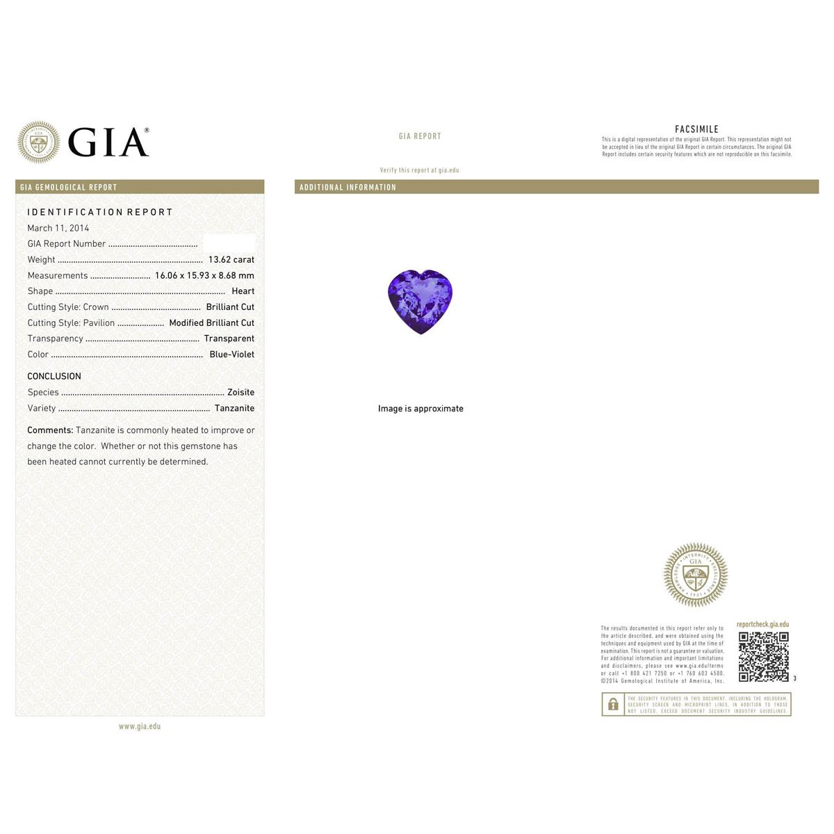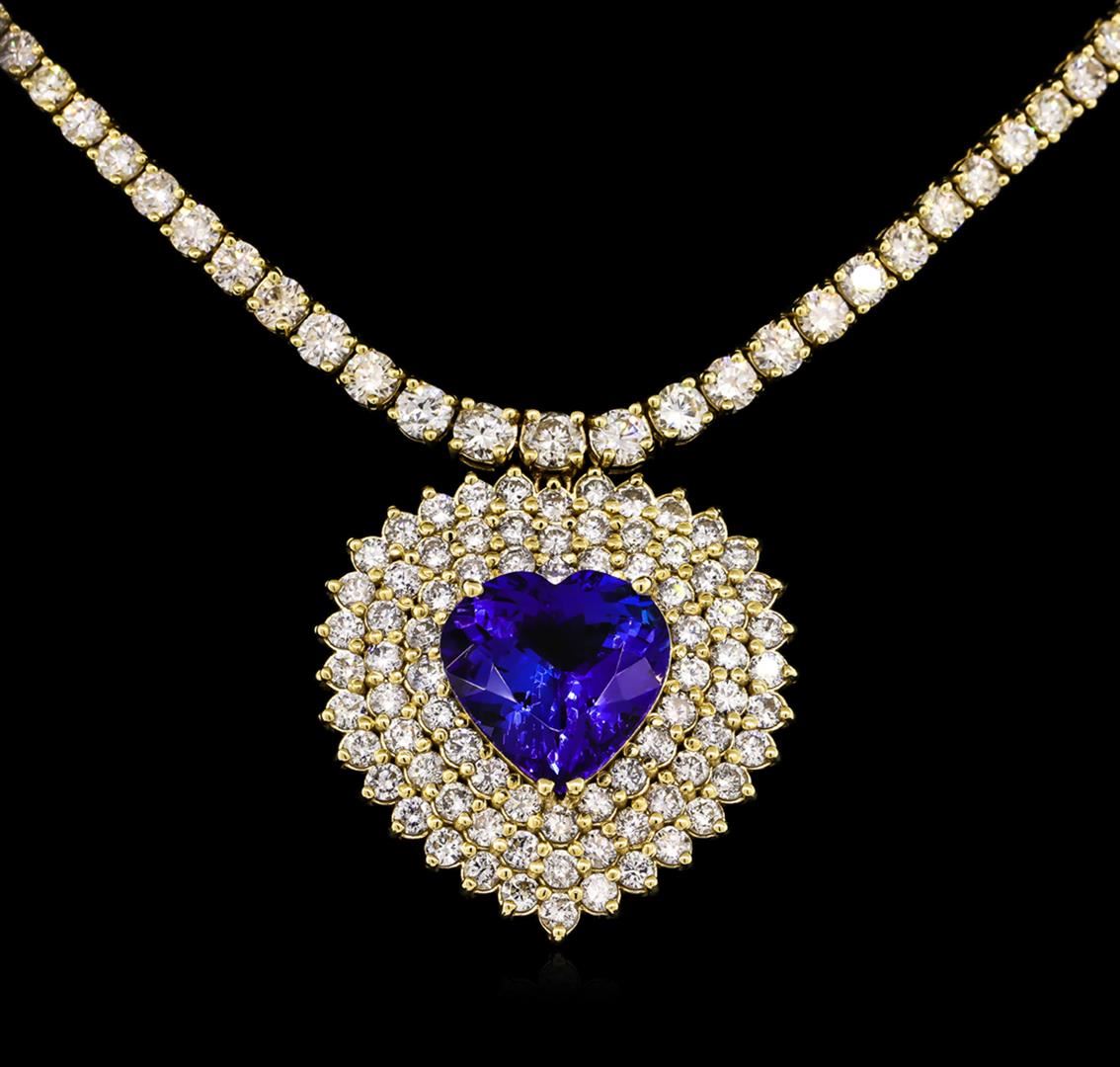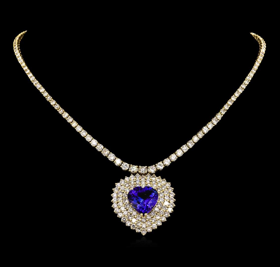One electronically tested 14KT yellow gold Ladies combination cast & assembled necklace with a hidden box clasp with a bright polish finish. Condition is new. Measurements: 16" in length. Identified with markings of "14K". Containing: One prong set heart modified brilliant cut natural tanzanite, measuring 16.06 x 15.93 x 8.68mm, exact weight 13.62ct., clarity is eye clean, type I, medium, moderately strong, bluish violet color, (GIA bV 5/4), cut is very good. GIA Report: 1156961713. One Hundred Seventy-Nine prong set round brilliant cut diamonds, measuring 3.20 - 2.50 x 1.71mm (depth est.) approximate. Total Weight of 179 Stones = 15.16ct. Clarity: SI-2 to I-1. Color: J - K, Cut is Good. Twenty-Seven prong set round brilliant cut diamonds, measuring 4.50 - 3.50 x 2.40mm (depth est.) approximate. Total Weight of 27 Stones = 6.32ct. Clarity: SI-2 to I-1. Color: J - K, Cut is Good. Total Weight of Colored Stones 13.62ct. Total Weight of Diamonds 21.48ct. Total Weight of Necklace 38.90 grams. GGL Appraised at $80,140.00.