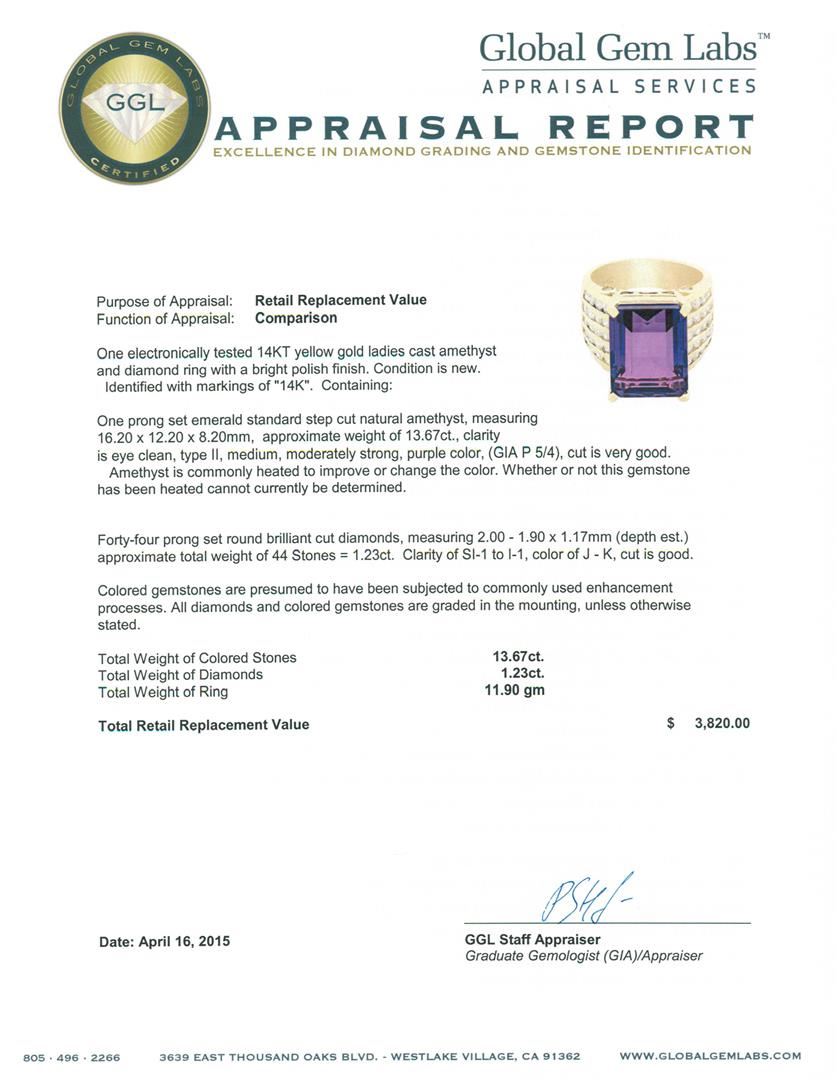 One electronically tested 14KT yellow gold ladies cast amethyst and diamond ring with a bright polish finish. Identified with markings of "14K". Condition is new. Containing: One prong set emerald standard step cut natural amethyst, measuring 16.20 x 12.20 x 8.20mm, approximate weight of 13.67ct., clarity is eye clean, type II, medium, moderately strong, purple color, (GIA P 5/4), cut is very good. Amethyst is commonly heated to improve or change the color. Whether or not this gemstone has been heated cannot currently be determined. Forty-Four prong set round brilliant cut diamonds, measuring 2.00 - 1.90 x 1.17mm (depth est.) approximate total weight of 44 Stones = 1.23ct. Clarity: SI-1 to I-1. Color: J - K, Cut is Good. Colored gemstones are presumed to have been subjected to commonly used enhancement processes. All diamonds and colored gemstones are graded in the mounting, unless otherwise stated. Total Weight of Colored Stones 13.67ct. Total Weight of Diamonds 1.23ct. Total Weight of Ring 11.90 grams. GGL Appraised.