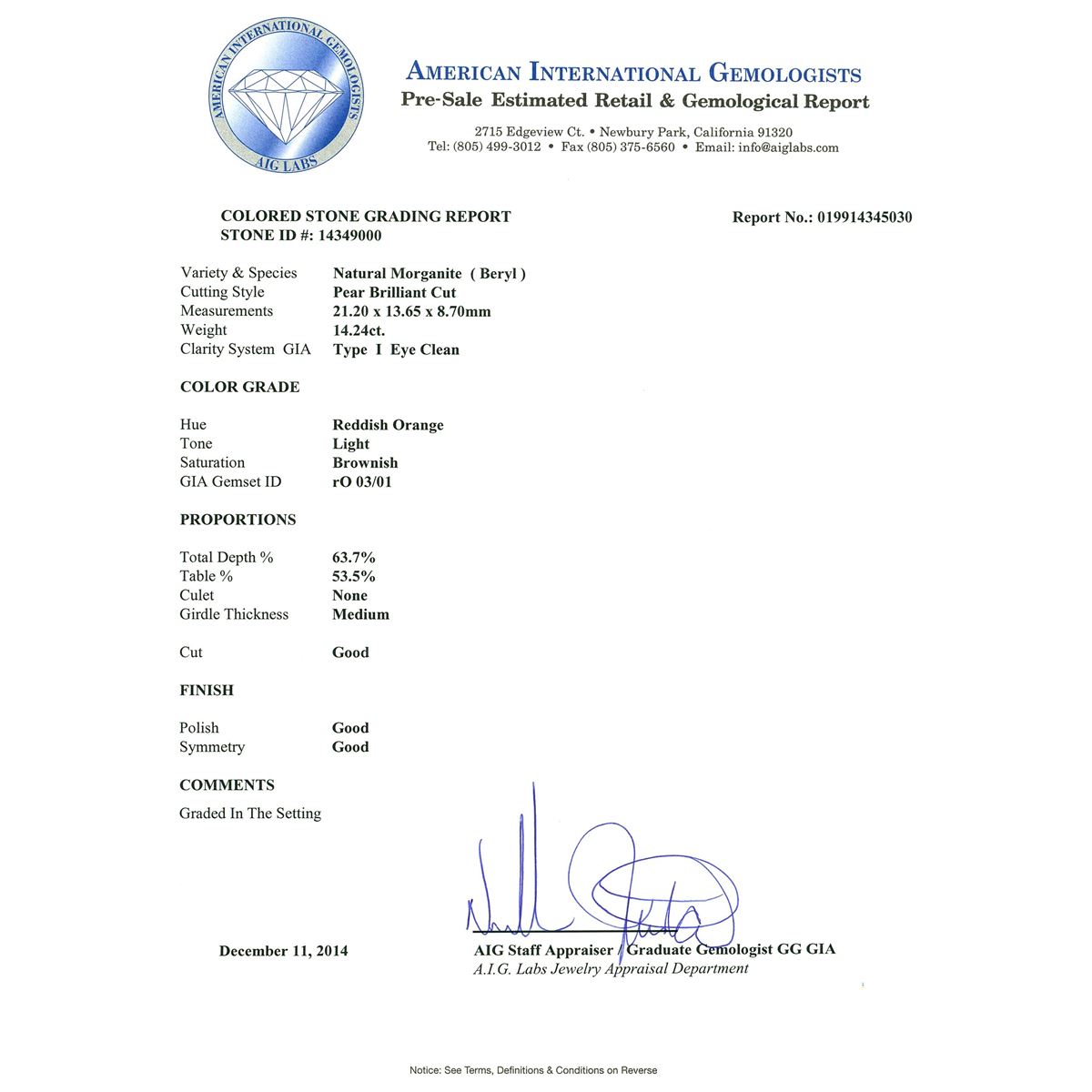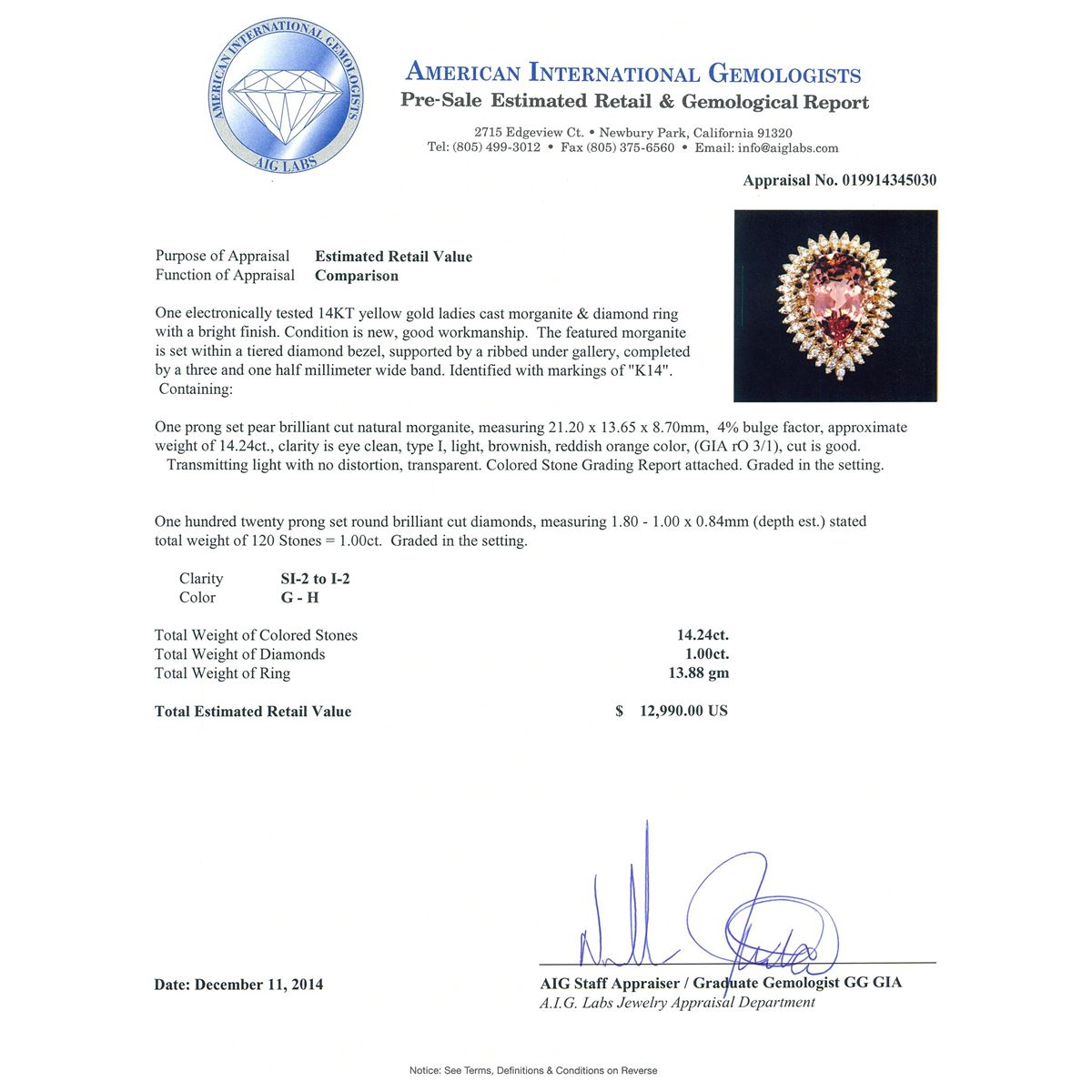 One electronically tested 14KT yellow gold ladies cast morganite & diamond ring with a bright finish. The featured morganite is set within a tiered diamond bezel, supported by a ribbed under gallery, completed by a three and one half millimeter wide band. Identified with markings of "K14". Condition is new, good workmanship. Containing: One prong set pear brilliant cut natural morganite, measuring 21.20 x 13.65 x 8.70mm, 4% bulge factor, approximate weight of 14.24ct., clarity is eye clean, type I, light, brownish, reddish orange color, (GIA rO 3/1), cut is good. Transmitting light with no distortion, transparent. Colored Stone Grading Report attached. Graded in the setting. One Hundred Twenty prong set round brilliant cut diamonds, measuring 1.80 - 1.00 x 0.84mm (depth est.) stated. Total Weight of 120 Stones = 1.00ct. Graded in the setting. Clarity: SI-2 to I-2. Color: G - H. Total Weight of Colored Stones 14.24ct. Total Weight of Diamonds 1.00ct. Total Weight of Ring 13.88 grams. AIG Appraised at $12,990.00.