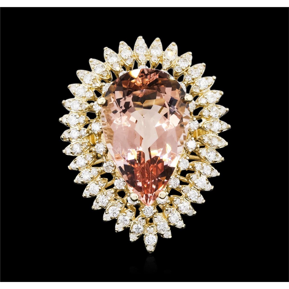 One electronically tested 14KT yellow gold ladies cast morganite & diamond ring with a bright finish. The featured morganite is set within a tiered diamond bezel, supported by a ribbed under gallery, completed by a three and one half millimeter wide band. Identified with markings of "K14". Condition is new, good workmanship. Containing: One prong set pear brilliant cut natural morganite, measuring 21.20 x 13.65 x 8.70mm, 4% bulge factor, approximate weight of 14.24ct., clarity is eye clean, type I, light, brownish, reddish orange color, (GIA rO 3/1), cut is good. Transmitting light with no distortion, transparent. Colored Stone Grading Report attached. Graded in the setting. One Hundred Twenty prong set round brilliant cut diamonds, measuring 1.80 - 1.00 x 0.84mm (depth est.) stated. Total Weight of 120 Stones = 1.00ct. Graded in the setting. Clarity: SI-2 to I-2. Color: G - H. Total Weight of Colored Stones 14.24ct. Total Weight of Diamonds 1.00ct. Total Weight of Ring 13.88 grams. AIG Appraised at $12,990.00.
