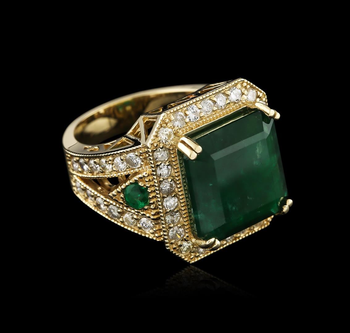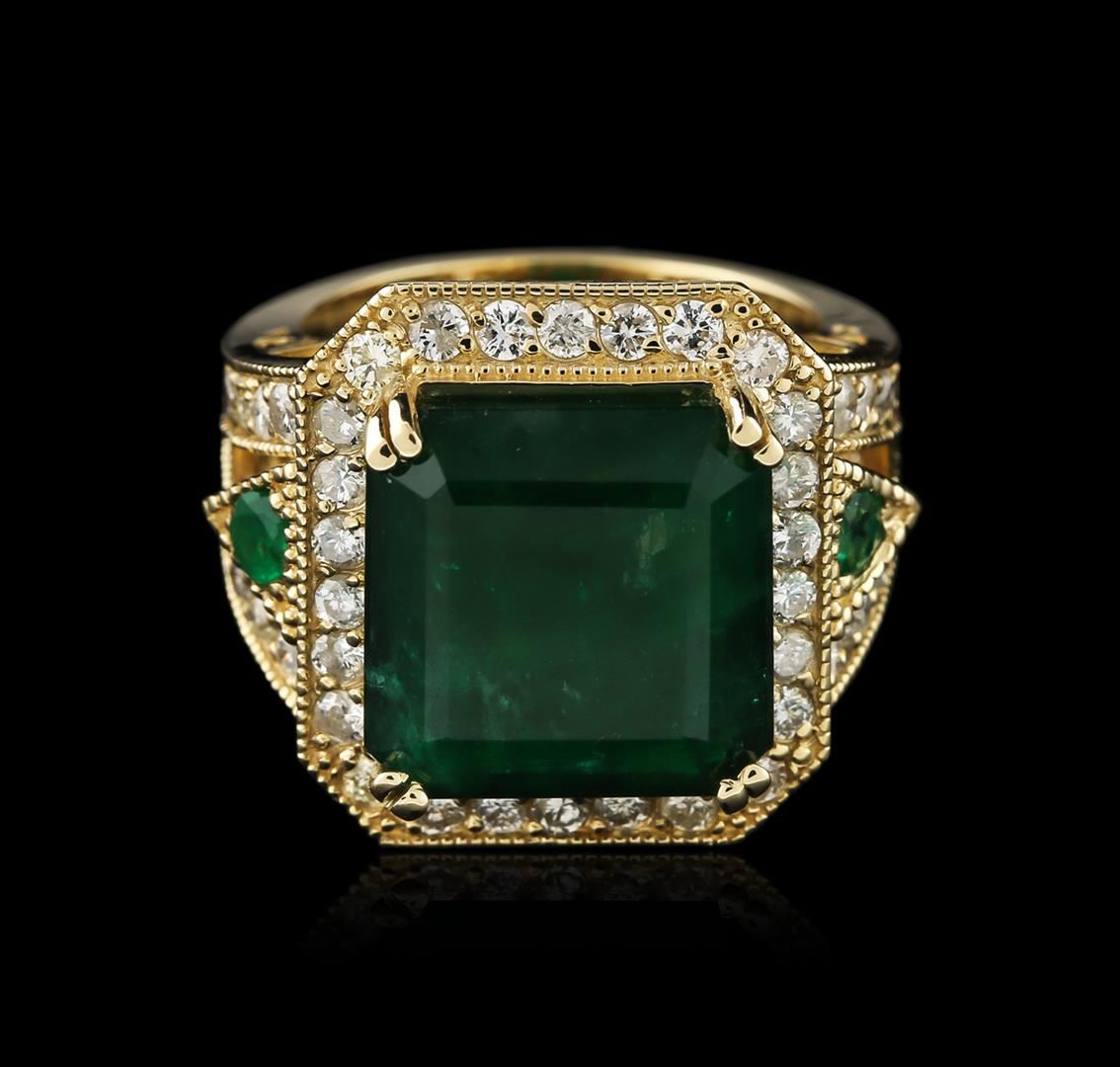 One electronically tested 14KT yellow gold ladies cast emerald and diamond ring with a split shoulder shank with a bright polish finish. Identified with markings of "K14". Condition is new. Containing: One prong set emerald modified step cut natural emerald, measuring 13.31 x 13.17 x 11.47mm, approximate weight of 14.77ct., clarity is heavily included, type III, medium, very slightly grayish, green color, (GIA G 5/3), cut is good. Two prong set round modified brilliant cut natural emeralds, measuring 3.20 - 3.20 x 2.08 mm, approximate total weight of 0.24ct., clarity is heavily included, type III, medium, moderately strong, green color, (GIA G 5/4), cut is good. Fifty prong set round brilliant cut diamonds, measuring 1.70 - 1.70 x 1.02mm (depth est.) approximate total weight of 50 Stones = 0.90ct. Clarity: I-1 to I-2. Color: I - J, Cut is Good. All diamonds and colored gemstones are graded in the mounting, unless otherwise stated. Colored gemstones are presumed to have been subjected to commonly used enhancement processes. Total Weight of Colored Stones 15.01ct. Total Weight of Diamonds 0.90ct. Total Weight of Ring 14.10 grams. GGL Appraised at $8,305.00.