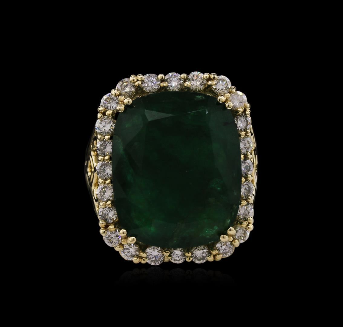 One electronically tested 14KT yellow gold ladies cast emerald and diamond ring with a bright polish finish. Condition is new, good workmanship. The featured emerald is set within a diamond bezel, supported by lattice work shoulders and completed by a two and one-half millimeter wide band. Identified with markings of "14K". Containing: One prong set rectangular cushion mixed cut natural emerald, measuring 18.50 x 15.30 x 6.80mm, 10% bulge factor, approximate weight of 15.27ct., clarity is heavily included, type III, medium dark, moderately strong, very slightly bluish green color, (GIA vslbG 6/4), cut is good. Transmitting light somewhat diffusely, translucent. Naturally occurring internal & external characteristics are present. Indications of oil, & opticon residue. Colored Stone Grading Report attached. Graded in the setting. Twenty-four prong set round brilliant cut diamonds, measuring 2.30 - 2.20 x 1.35mm (depth est.) approximate total weight of 24 Stones = 1.17ct. Faint secondary color throughout. Graded in the setting. Clarity SI-1 to I-1. Color J -- L. Total Weight of Colored Stones 15.27ct. Total Weight of Diamonds 1.17ct. Total Weight of Ring 11.80gm. AIG Appraised at $15,110.00.