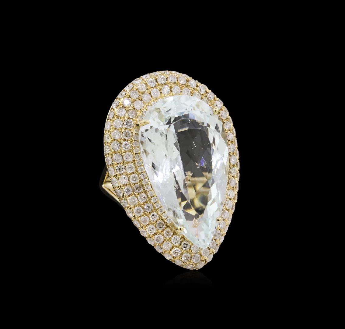 One electronically tested 14KT yellow gold Ladies combination cast & assembled ring with a bright polish finish. Condition is new. Identified with markings of "14K". Containing: One prong set pear modified brilliant cut natural aquamarine, measuring 23.59 x 13.86 x 8.95mm, exact weight 15.52ct., clarity is eye clean, type I, light, very slightly grayish, very slightly greenish blue color, (GIA vslgB 3/3), cut is good. GIA Report: 1156952840.One Hundred Thirty-Two prong set round brilliant cut diamonds, measuring 1.30 - 1.30 x 0.78mm (depth est.) approximate. Total Weight of 132 Stones = 1.55ct. Clarity: I-2 to I-3. Color: I - J, Cut is Good. Forty-Nine prong set round brilliant cut diamonds, measuring 1.00 - 1.00 x 0.60mm (depth est.) approximate. Total Weight of 49 Stones = 0.17ct. Clarity: I-2 to I-3. Color: I - J, Cut is Good. Total Weight of Colored Stones 15.52ct. Total Weight of Diamonds 1.72ct. Total Weight of Ring 9.50 grams. GGL Appraised at $22,180.00.