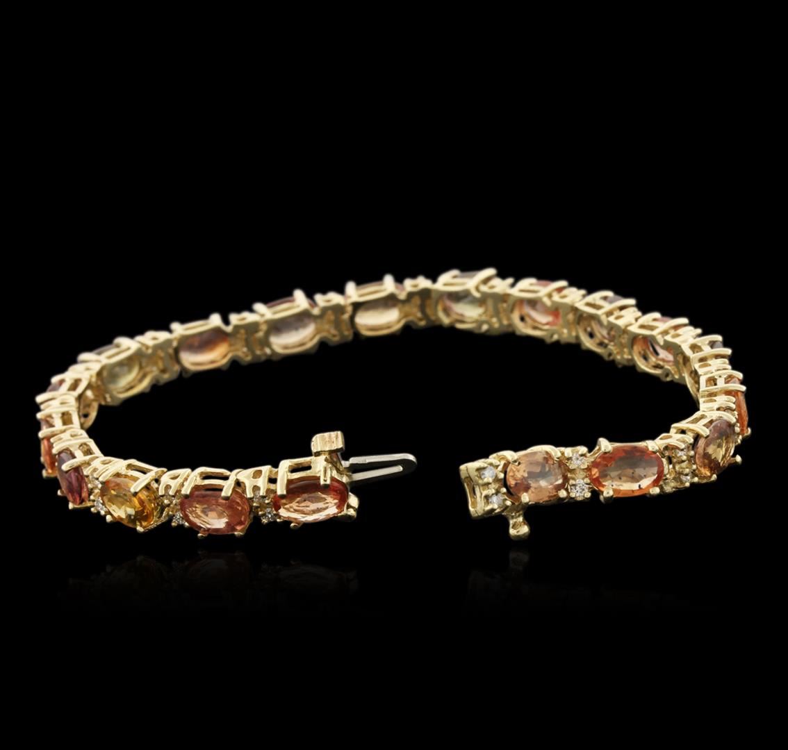 One electronically tested 14KT yellow gold ladies cast sapphire and diamond bracelet with a hidden box clasp with safety closer with a bright polish finish. Measurements: 7" in length Identified with markings of "14K". Condition is new. Containing: Nineteen prong set oval modified brilliant cut natural multicolor sapphires, measuring 6.50 x 4.80 x 3.12mm, approximate total weight of 15.58ct., clarity is slightly included, type II, medium light, very slightly grayish, orange and yellow color, (GIA V 4/3), cut is good. Thirty-Eight prong set round brilliant cut diamonds, measuring 1.30 - 1.30 x 0.78mm (depth est.) approximate total weight of 38 Stones = 0.30ct. Clarity: SI-2 to I-1. Color: J - K, Cut is Good. Colored gemstones are presumed to have been subjected to commonly used enhancement processes. All diamonds and colored gemstones are graded in the mounting, unless otherwise stated. Total Weight of Colored Stones 15.58ct. Total Weight of Diamonds 0.30ct. Total Weight of Bracelet 15.20 grams. GGL Appraised at $4,820.00.