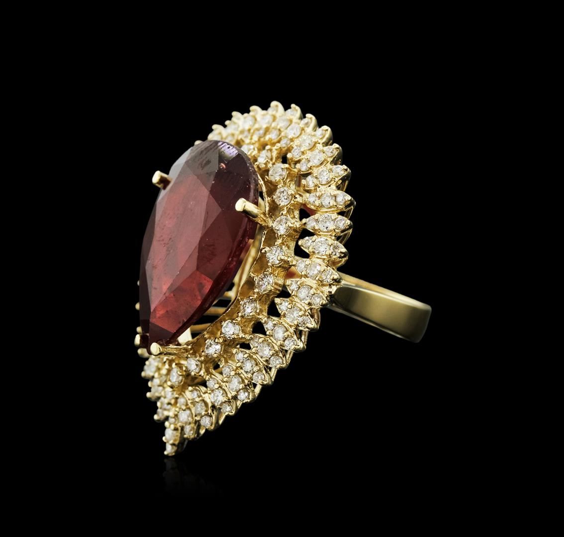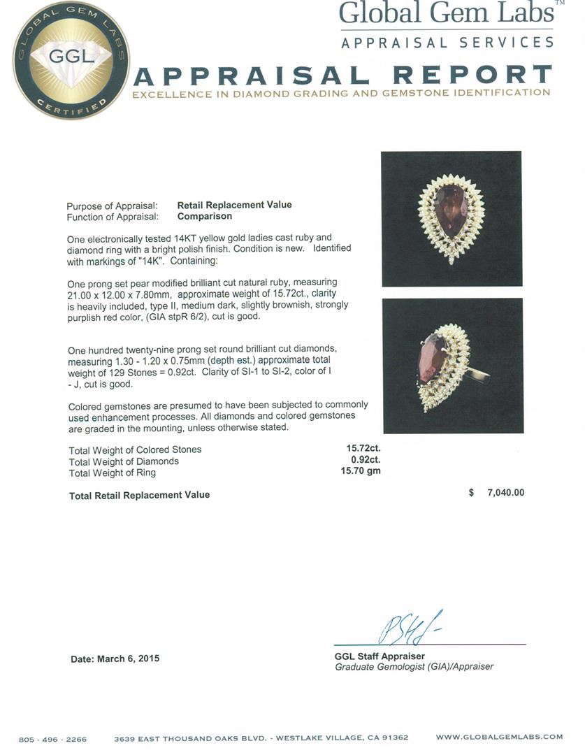 One electronically tested 14KT yellow gold ladies cast ruby and diamond ring with a bright polish finish. Identified with markings of "14K". Condition is new. Containing: One prong set pear modified brilliant cut natural ruby, measuring 21.00 x 12.00 x 7.80mm, approximate weight of 15.72ct., clarity is heavily included, type II, medium dark, slightly brownish, strongly purplish red color, (GIA stpR 6/2), cut is good. One Hundred Twenty-Nine prong set round brilliant cut diamonds, measuring 1.30 - 1.20 x 0.75mm (depth est.) approximate total weight of 129 Stones = 0.92ct.. Clarity: SI-1 to SI-2. Color: I - J, Cut is Good. Colored gemstones are presumed to have been subjected to commonly used enhancement processes. All diamonds and colored gemstones are graded in the mounting, unless otherwise stated.. Total Weight of Colored Stones 15.72ct.. Total Weight of Diamonds 0.92ct.. Total Weight of Ring 15.70 grams. GGL Appraised.