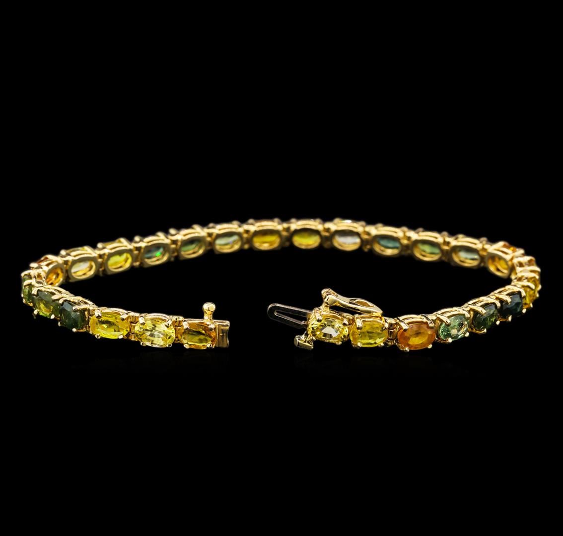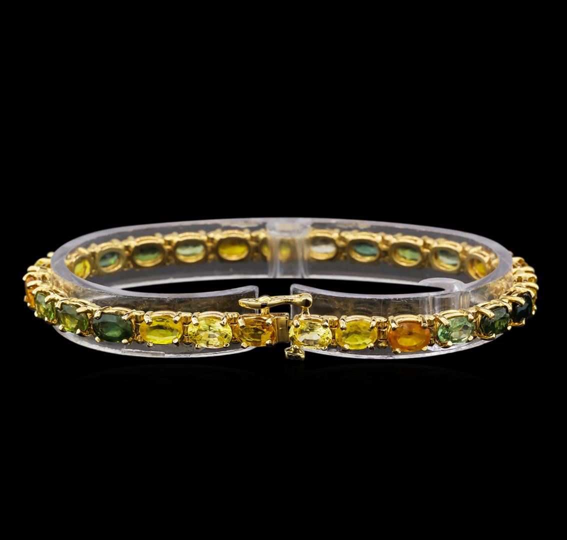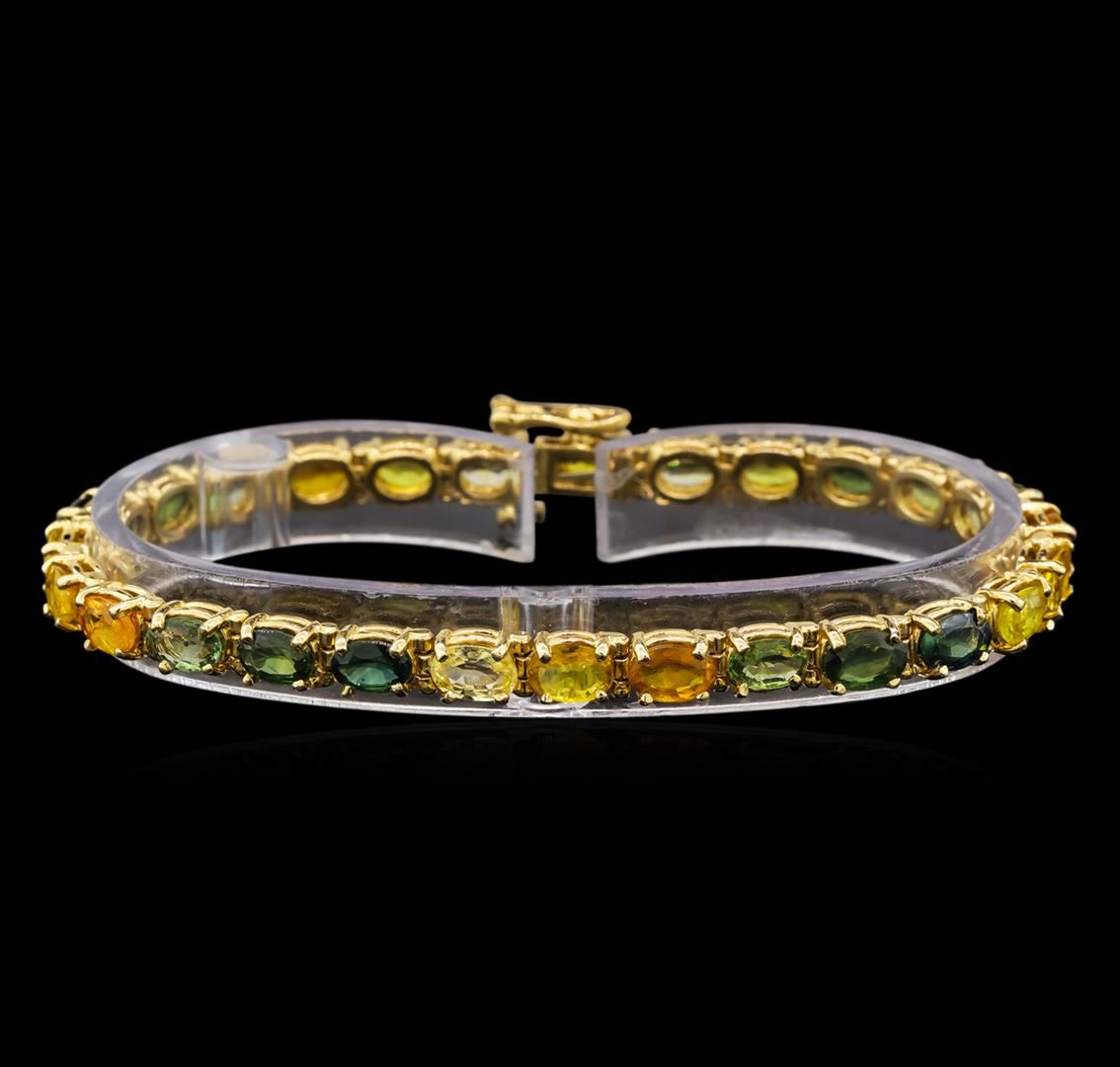 One electronically tested 14KT yellow gold ladies cast sapphire bracelet with a hidden box clasp with safety closer with a bright polish finish. Measurements: 7 inches in length. Identified with markings of "14K". Condition is new. Containing: Twenty-seven prong set oval modified brilliant cut natural multicolor sapphires, measuring 6.20 x 4.20 x 2.73mm, approximate total weight of 16.20ct., clarity is moderately included, very light, very slightly grayish, green, yellow and orange color, (GIA bV 2/3), cut is good. Colored gemstones are presumed to have been subjected to commonly used enhancement processes. All colored gemstones are graded in the mounting, unless otherwise stated. Total Weight of Colored Stones 16.20ct. Total Weight of Bracelet 14.00. grams. GGL Appraised at $3,210.00.
