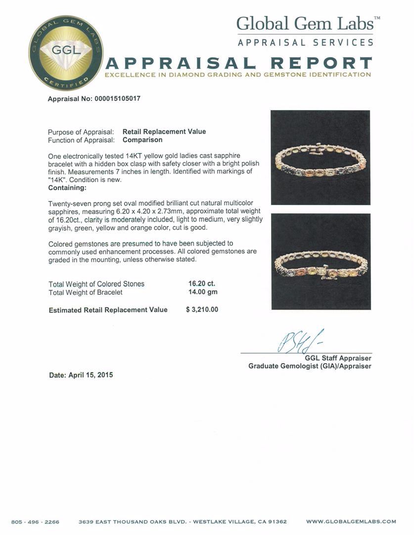 One electronically tested 14KT yellow gold ladies cast sapphire bracelet with a hidden box clasp with safety closer with a bright polish finish. Measurements: 7 inches in length. Identified with markings of "14K". Condition is new. Containing: Twenty-seven prong set oval modified brilliant cut natural multicolor sapphires, measuring 6.20 x 4.20 x 2.73mm, approximate total weight of 16.20ct., clarity is moderately included, very light, very slightly grayish, green, yellow and orange color, (GIA bV 2/3), cut is good. Colored gemstones are presumed to have been subjected to commonly used enhancement processes. All colored gemstones are graded in the mounting, unless otherwise stated. Total Weight of Colored Stones 16.20ct. Total Weight of Bracelet 14.00. grams. GGL Appraised at $3,210.00.