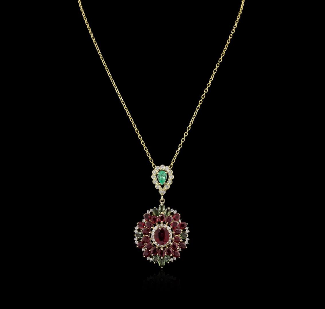 One electronically tested 14KT yellow gold ladies cast emerald, ruby, sapphire and diamond pendant & chain 18.0" long, with a lobster claw clasp with a bright polish finish. Identified with markings of "14K". Condition is new. Containing: One prong set pear modified brilliant cut natural emerald, measuring 8.50 x 5.50 x 3.58mm, approximate weight of 1.00ct., clarity is moderately included, type III, light, very slightly grayish, green color, (GIA G 3/3), cut is good. One prong set oval modified brilliant cut natural ruby, measuring 10.50 x 9.00 x 5.85mm, approximate weight of 4.20ct., clarity is heavily included, medium dark, moderately strong, strongly purplish red color, (GIA stpR 6/4), cut is good. Twenty-two prong set oval modified brilliant cut natural rubies, measuring 5.00 x 3.00 x 1.95mm, approximate total weight of 12.34ct., clarity is heavily included, medium, moderately strong, strongly purplish red color, (GIA stpR 5/4), cut is good. Eight prong set oval modified brilliant cut natural green sapphires, measuring 5.00 x 3.00 x 1.95mm, approximate total weight of 3.72ct., clarity is moderately included, medium light, very slightly grayish, green color, (GIA G 4/3), cut is good. Fifty-One prong set round brilliant cut diamonds, measuring 2.00 - 1.90 x 1.17mm (depth est.) approximate total weight of 51 Stones = 1.28ct. Clarity: SI-1. Color: J - K, Cut is Good. Colored gemstones are presumed to have been subjected to commonly used enhancement processes. All diamonds and colored gemstones are graded in the mounting, unless otherwise stated. Total Weight of Colored Stones 21.26ct. Total Weight of Diamonds 1.28ct. Total Weight of Pendant & Chain 24.50 grams. GGL Appraised at $8,410.00.