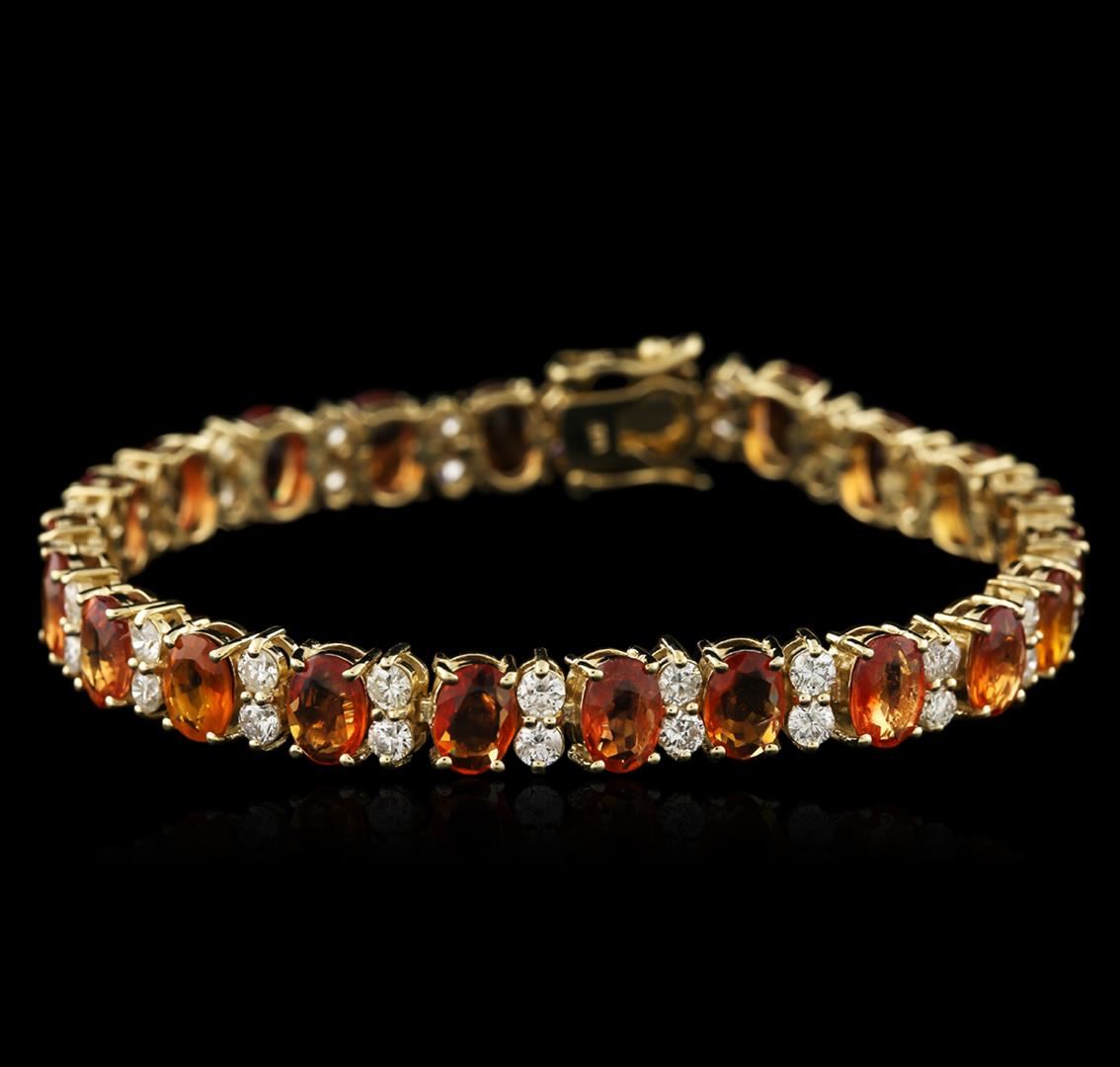 One electronically tested 14KT yellow gold ladies cast sapphire and diamond bracelet with a hidden box clasp with safety closer with a bright polish finish. Measurements: 6.75" in length Identified with markings of "14K". Condition is new. Containing: Twenty-two prong set oval modified brilliant cut natural yellow sapphires, measuring 7.00 x 5.00 x 3.25mm, approximate total weight of 16.75ct., clarity is slightly included, type II, medium light, brownish, orangy yellow color, (GIA oY 4/3), cut is good. Forty-Four prong set round brilliant cut diamonds, measuring 2.50 - 2.50 x 1.50mm (depth est.) approximate total weight of 44 Stones = 3.60ct. Clarity: SI-1 to I-1. Color: J - K, Cut is Good. All diamonds and colored gemstones are graded in the mounting, unless otherwise stated. Colored gemstones are presumed to have been subjected to commonly used enhancement processes. Total Weight of Colored Stones 16.75ct. Total Weight of Diamonds 3.60ct. Total Weight of Bracelet 19.10 grams. GGL Appraised at $11,620.00.