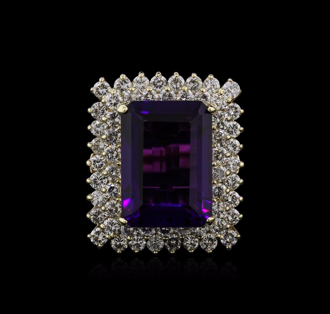 One electronically tested 14KT yellow gold ladies cast amethyst and diamond ring with a bright polish finish. Identified with markings of "K14". Condition is new. Containing: One prong set rectangular modified brilliant cut natural amethyst, measuring 18.06 x 13.08 x 8.91mm, approximate weight of 16.80ct., clarity is eye clean, type II, medium, moderately strong, purple color, (GIA P 5/4), cut is good. Fifty-Six prong set round brilliant cut diamonds, measuring 2.40 - 2.40 x 1.44mm (depth est.) approximate total weight of 56 Stones = 2.83ct. Clarity: I-1 to I-2. Color: L - M, Cut is Good. Diamonds and colored gemstones are graded in the mounting, unless otherwise stated. Colored gemstones are presumed to have been subjected to commonly used enhancement processes. Total Weight of Colored Stones 16.80ct. Total Weight of Diamonds 2.83ct. Total Weight of Ring 16.00 grams. GGL Appraised at $5,685.00.
