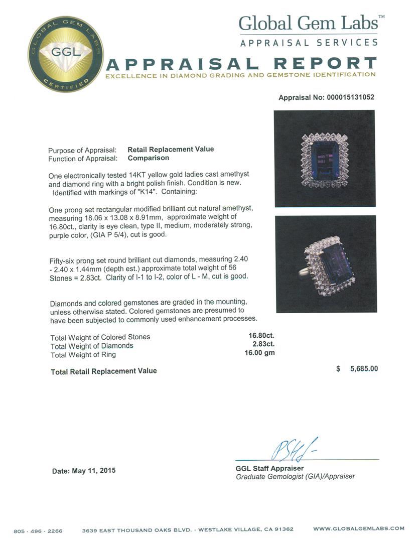 One electronically tested 14KT yellow gold ladies cast amethyst and diamond ring with a bright polish finish. Identified with markings of "K14". Condition is new. Containing: One prong set rectangular modified brilliant cut natural amethyst, measuring 18. GGL Appraised at $5,685.00.