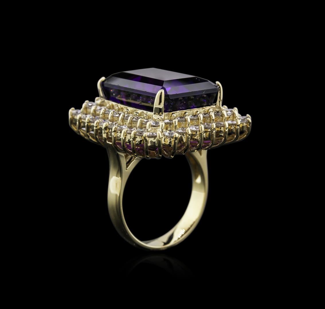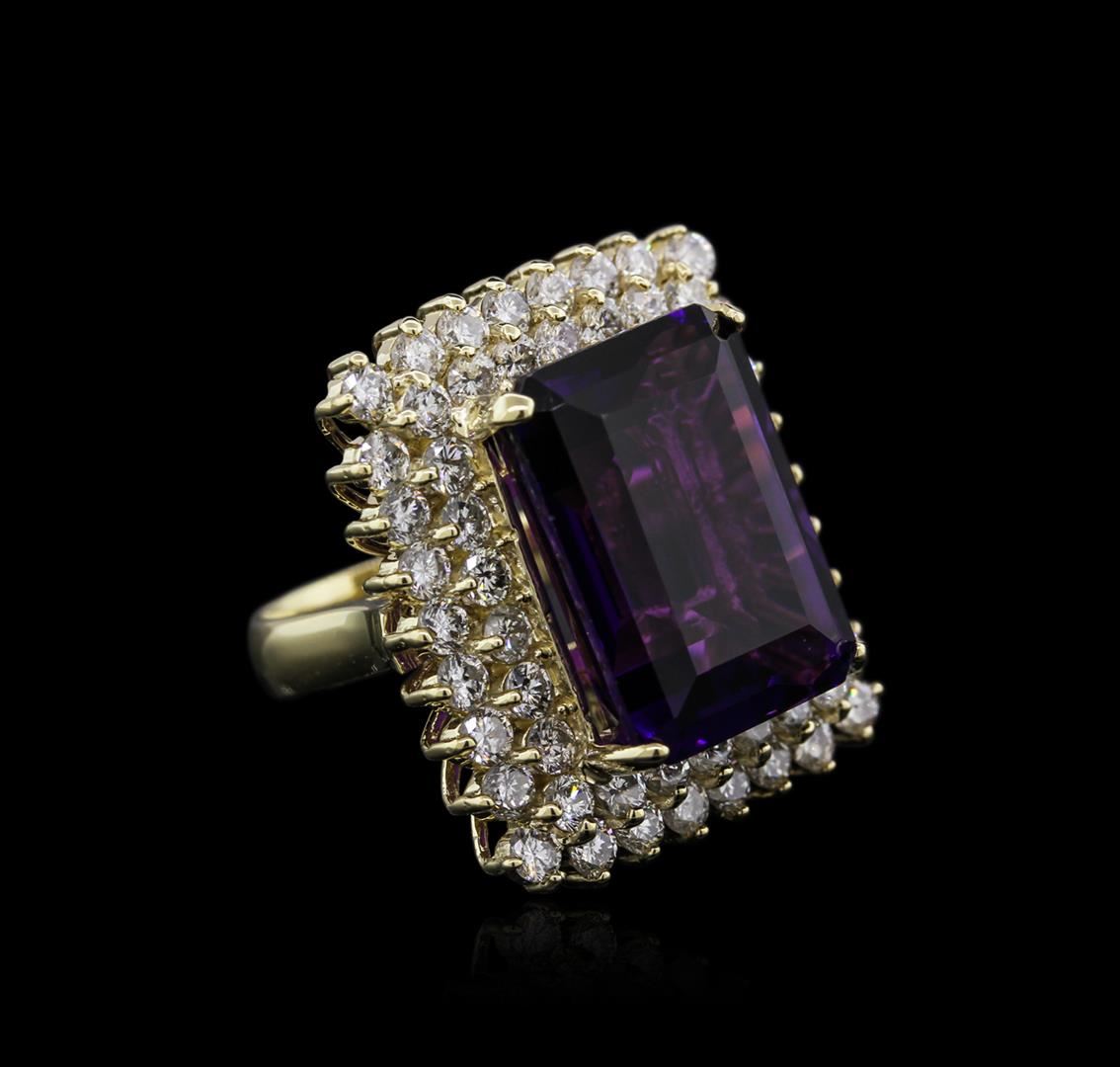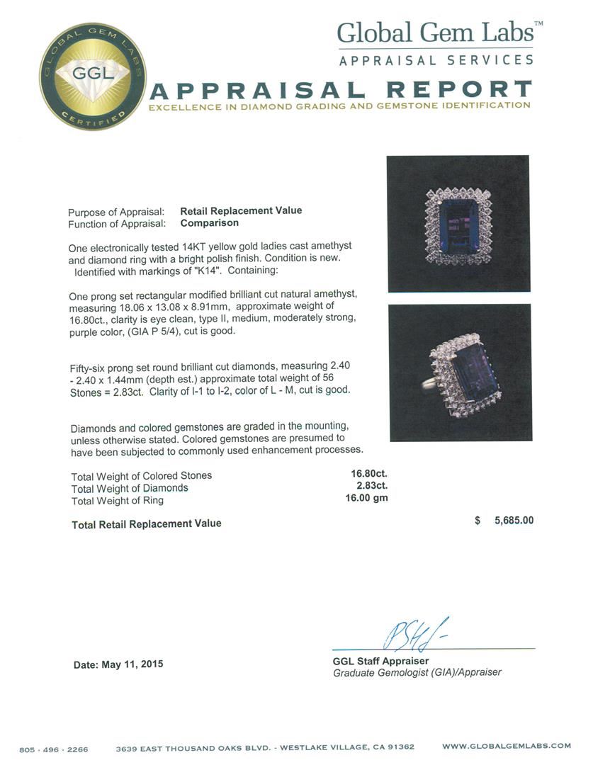 One electronically tested 14KT yellow gold ladies cast amethyst and diamond ring with a bright polish finish. Identified with markings of "K14". Condition is new. Containing: One prong set rectangular modified brilliant cut natural amethyst, measuring 18.06 x 13.08 x 8.91mm, approximate weight of 16.80ct., clarity is eye clean, type II, medium, moderately strong, purple color, (GIA P 5/4), cut is good. Fifty-Six prong set round brilliant cut diamonds, measuring 2.40 - 2.40 x 1.44mm (depth est.) approximate total weight of 56 Stones = 2.83ct. Clarity: I-1 to I-2. Color: L - M, Cut is Good. Diamonds and colored gemstones are graded in the mounting, unless otherwise stated. Colored gemstones are presumed to have been subjected to commonly used enhancement processes. Total Weight of Colored Stones 16.80ct. Total Weight of Diamonds 2.83ct. Total Weight of Ring 16.00 grams. GGL Appraised at $5,685.00.