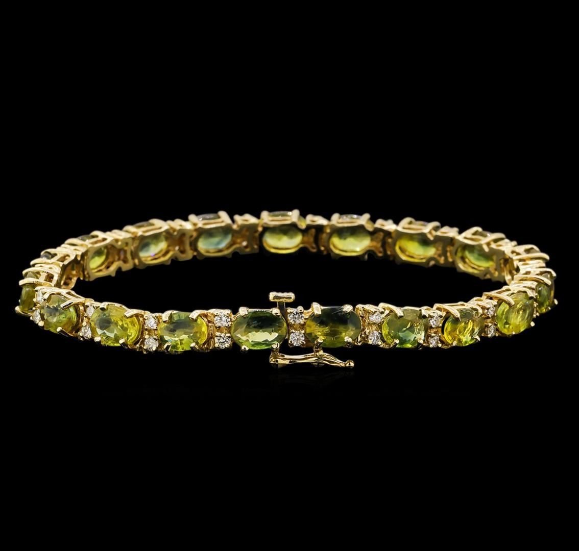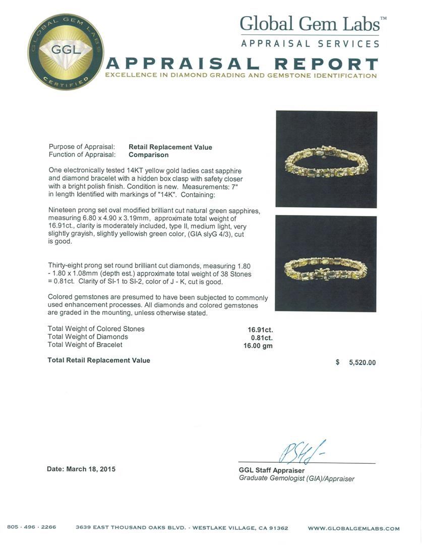One electronically tested 14KT yellow gold ladies cast sapphire and diamond bracelet with a hidden box clasp with safety closer with a bright polish finish. Measurements: 7" in length Identified with markings of "14K". Condition is new. Containing: Nineteen prong set oval modified brilliant cut natural green sapphires, measuring 6.80 x 4.90 x 3.19mm, approximate total weight of 16.91ct., clarity is moderately included, type II, medium light, very slightly grayish, slightly yellowish green color, (GIA slyG 4/3), cut is good. Thirty-Eight prong set round brilliant cut diamonds, measuring 1.80 - 1.80 x 1.08mm (depth est.) approximate total weight of 38 Stones = 0.81ct. Clarity of SI-1 to SI-2, Color of J - K, Cut is Good. Colored gemstones are presumed to have been subjected to commonly used enhancement processes. All diamonds and colored gemstones are graded in the mounting, unless otherwise stated. Total Weight of Colored Stones 16.91ct. Total Weight of Diamonds 0.81ct. Total Weight of Bracelet 16.00 grams. GGL Appraised at $5,520.00.