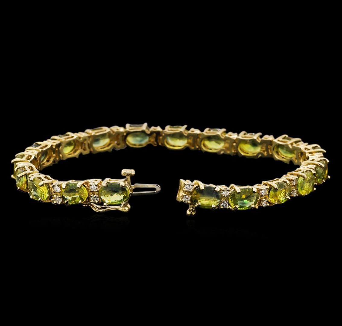 One electronically tested 14KT yellow gold ladies cast sapphire and diamond bracelet with a hidden box clasp with safety closer with a bright polish finish. Measurements: 7" in length Identified with markings of "14K". Condition is new. Containing: Nineteen prong set oval modified brilliant cut natural green sapphires, measuring 6.80 x 4.90 x 3.19mm, approximate total weight of 16.91ct., clarity is moderately included, type II, medium light, very slightly grayish, slightly yellowish green color, (GIA slyG 4/3), cut is good. Thirty-Eight prong set round brilliant cut diamonds, measuring 1.80 - 1.80 x 1.08mm (depth est.) approximate total weight of 38 Stones = 0.81ct. Clarity of SI-1 to SI-2, Color of J - K, Cut is Good. Colored gemstones are presumed to have been subjected to commonly used enhancement processes. All diamonds and colored gemstones are graded in the mounting, unless otherwise stated. Total Weight of Colored Stones 16.91ct. Total Weight of Diamonds 0.81ct. Total Weight of Bracelet 16.00 grams. GGL Appraised at $5,520.00.