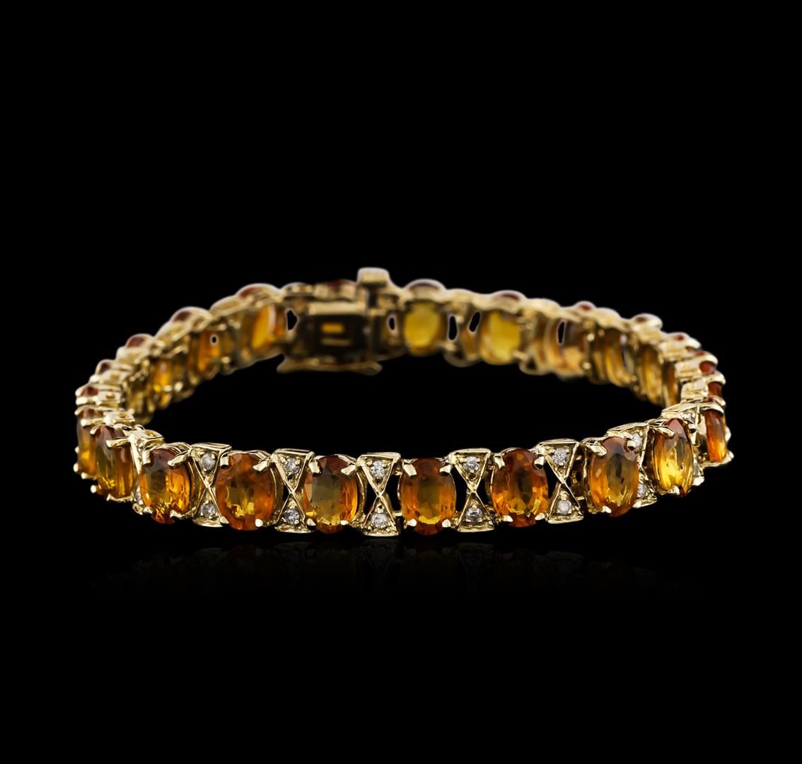 One electronically tested 14KT yellow gold ladies cast sapphire and diamond bracelet with a hidden box clasp with safety closer with a bright polish finish. Measurements: 7" in length Identified with markings of "14K". Condition is new. Containing: Twenty-three prong set oval modified brilliant cut natural orange sapphires, measuring 6.80 x 5.10 x 2.55mm, approximate total weight of 17.02ct., clarity is slightly included, type II, medium light, moderately strong, yellowish orange color, (GIA yO 4/4), cut is good. Forty-Six prong set round brilliant cut diamonds, measuring 1.30 - 1.30 x 0.78mm (depth est.) approximate total weight of 46 Stones = 0.37ct. Clarity of SI-2 to I-1, Color of I - J, Cut is Good. Colored gemstones are presumed to have been subjected to commonly used enhancement processes. All diamonds and colored gemstones are graded in the mounting, unless otherwise stated. Total Weight of Colored Stones 17.02ct. Total Weight of Diamonds 0.37ct. Total Weight of Bracelet 17.50 grams. GGL Appraised at $5,330.00.