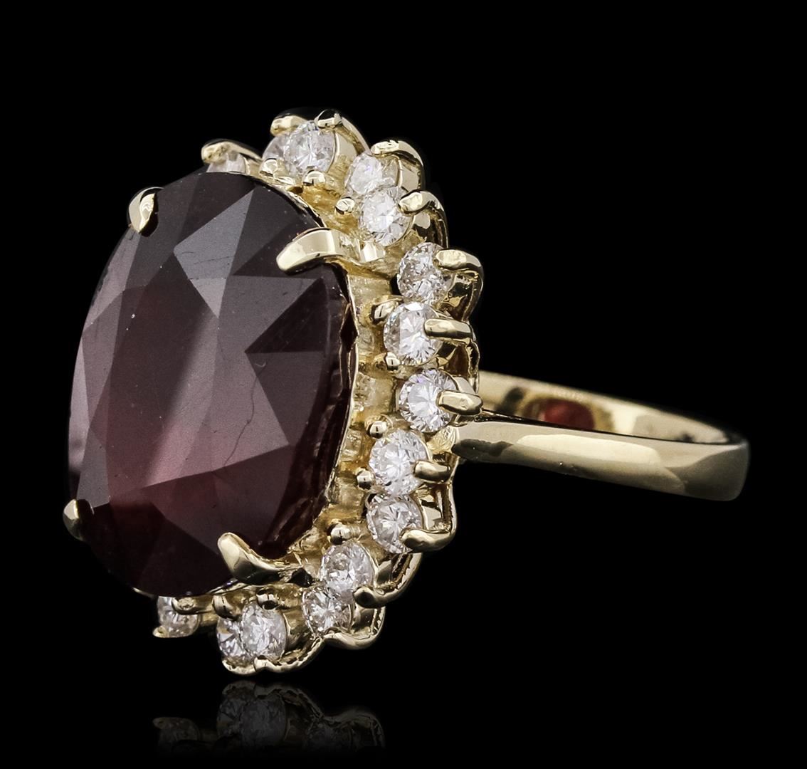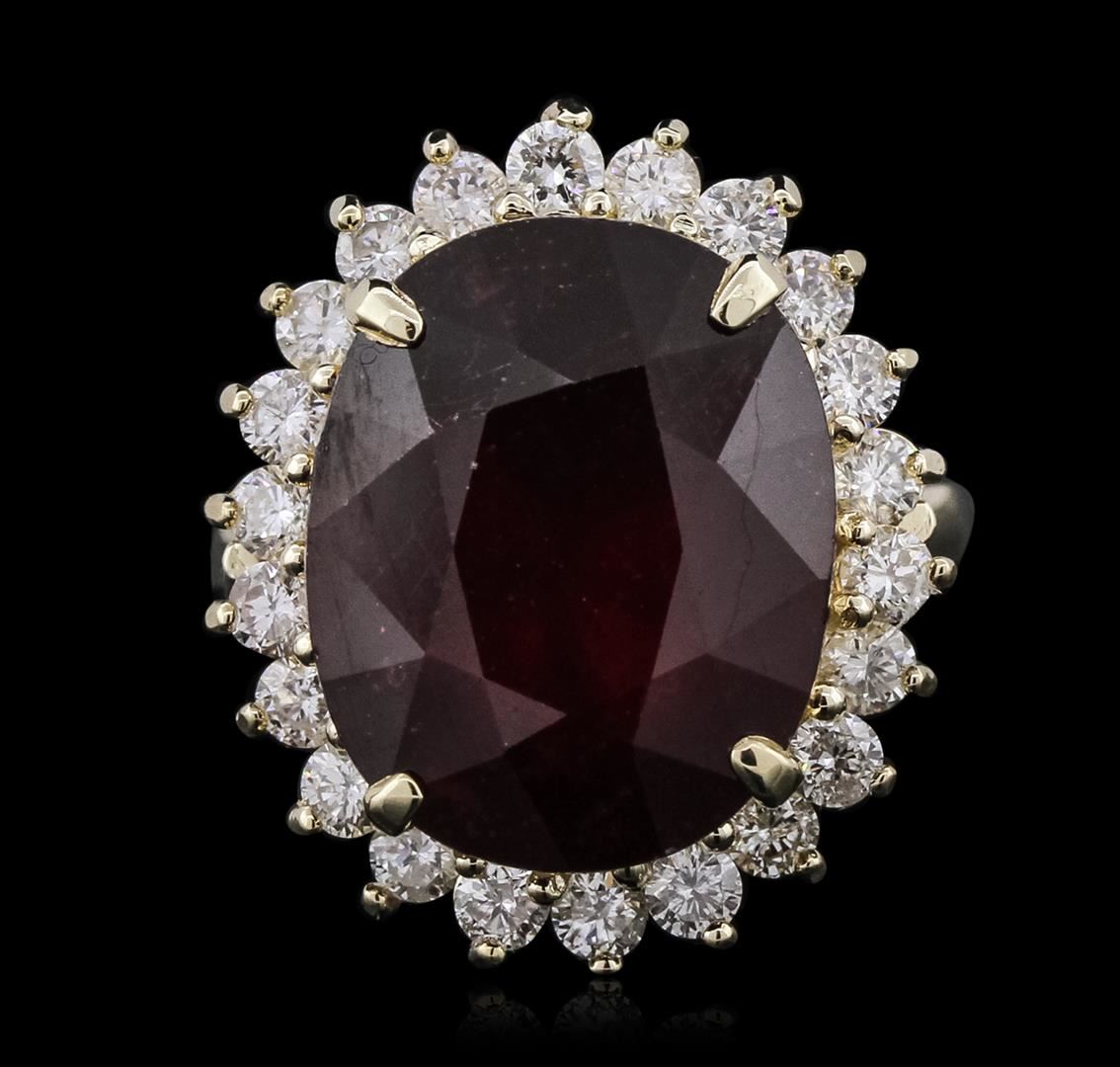 One electronically tested 14KT yellow gold ladies cast ruby and diamond ring with a bright polish finish. The featured ruby is set within a stylized diamond bezel, completed by a two and one-half millimeter wide band. Identified with markings of "14K". Condition is new, good workmanship. Containing: One prong set oval mixed cut natural ruby, measuring 16.40 x 13.30 x 9.10mm, 8% bulge factor, approximate weight of 17.34ct., clarity is heavily included, type II, dark, very slightly brownish, slightly purplish red color, (GIA slpR 7/3), cut is good. Transmitting light somewhat diffusely, transparent to translucent. Naturally occurring internal & external characteristics are present. Indications of laboratory high temperature heat treatment, with glass & flux additives. Graded in the setting. Ruby has a low tolerance to rhodium plating, repolishing the surface, & ultrasonic cleaning. Twenty-Two prong set round brilliant cut diamonds, measuring 2.50 - 2.30 x 1.44mm (depth est.) approximate total weight of 22 Stones = 1.21ct. Graded in the setting. Clarity: SI-1 to I-1. Color: G - I. Total Weight of Colored Stones 17.34ct. Total Weight of Diamonds 1.21ct. Total Weight of Ring 9.64 grams. AIG Appraised at $8,140.00.