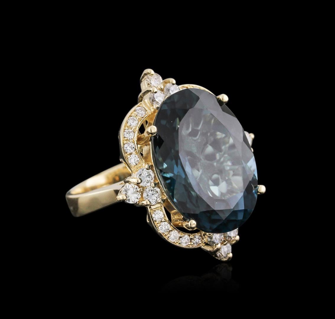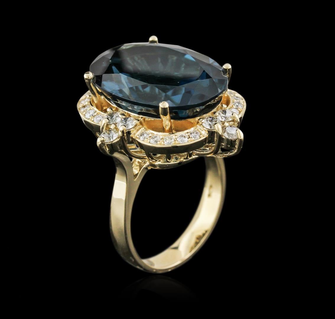 One electronically tested 14KT yellow gold ladies cast topaz and diamond ring with a bright polish finish. Identified with markings of "14K". Condition is new. Containing: One prong set oval modified brilliant cut natural blue topaz, measuring 19.80 x 14.66 x 8.08mm, approximate weight of 17.39ct., clarity is eye clean, type I, medium, moderately strong, very slightly greenish blue color, (GIA vslgB 5/4), cut is good. Thirty-Two prong set round brilliant cut diamonds, measuring 2.50 - 1.30 x 1.14mm (depth est.) approximate total weight of 32 Stones = 0.50ct. Clarity: SI-1 to SI-2. Color: I - J, Cut is Good. Colored gemstones are presumed to have been subjected to commonly used enhancement processes. All diamonds and colored gemstones are graded in the mounting, unless otherwise stated. Total Weight of Colored Stones 17.39ct. Total Weight of Diamonds 0.50ct. Total Weight of Ring 13.70 grams. GGL Appraised at $4,265.00.