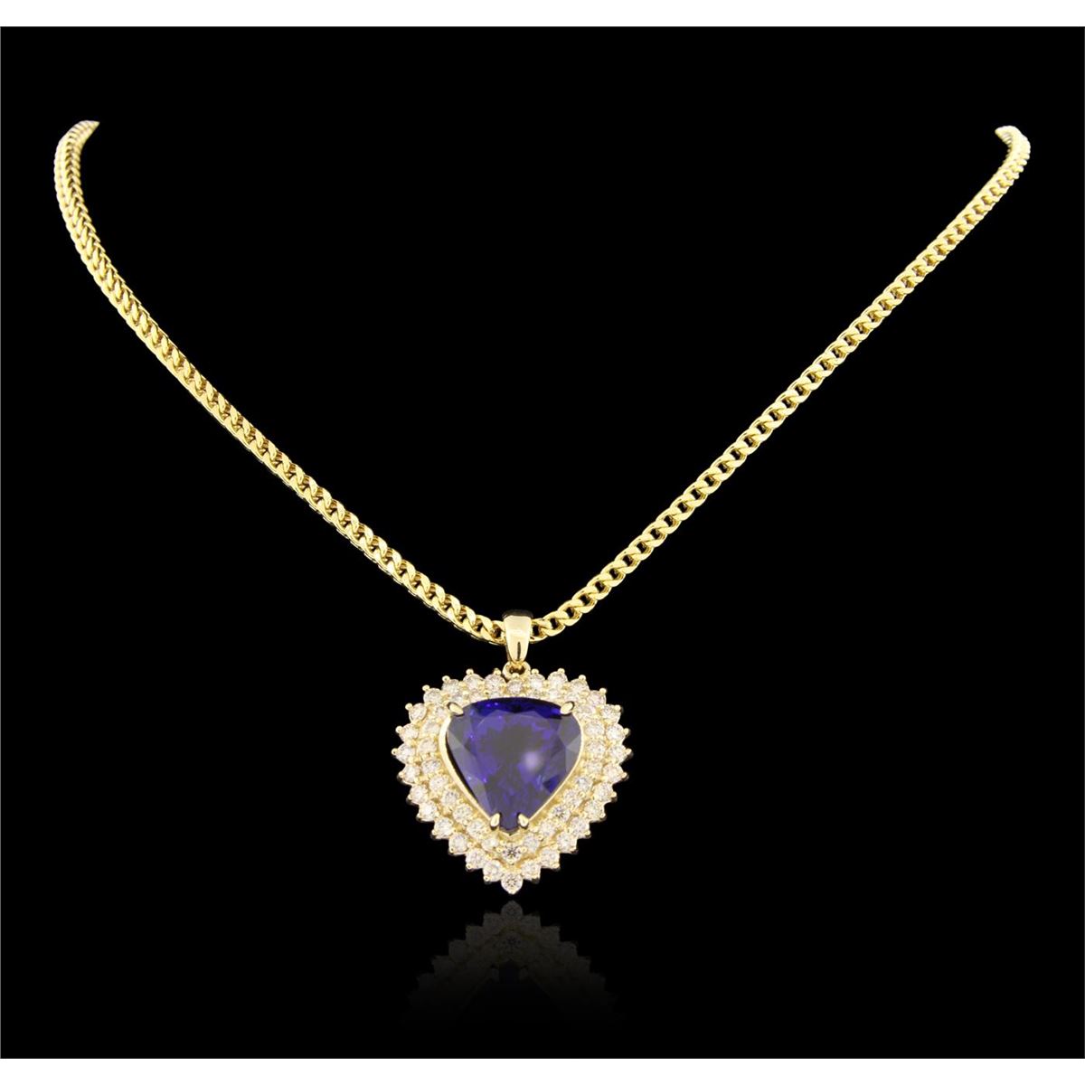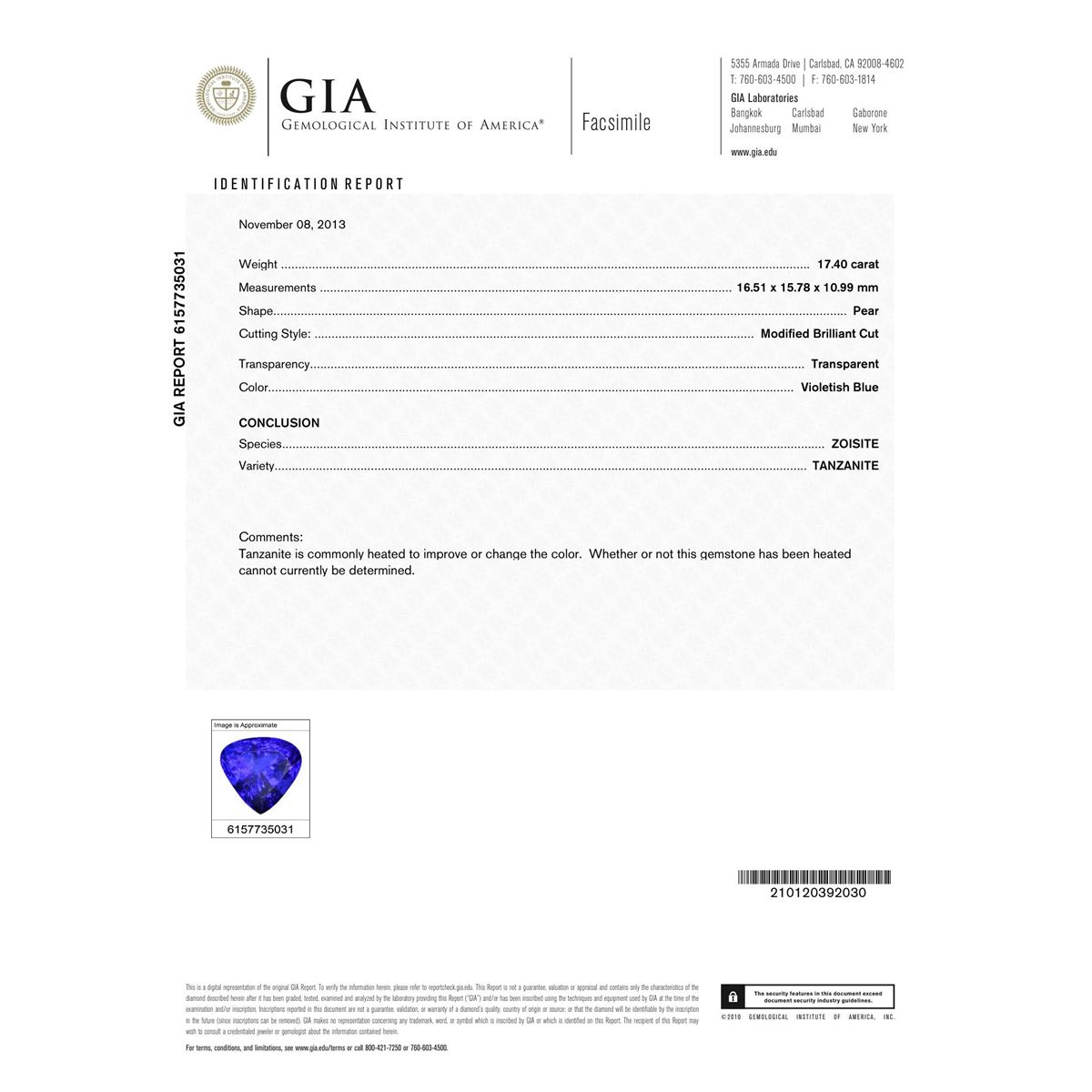 One electronically tested 14KT yellow gold ladies cast tanzanite and diamond pendant with chain. Condition is new, good workmanship. The pendant features a tanzanite set within a two tiered diamond lattice gallery, completed by a yellow gold bail. The pendant is supported by a twenty inch length 14KT yellow gold designer style chain terminating in a lobster claw clasp. Bright polish finish. Containing: One prong set pear mixed cut natural tanzanite, measuring 16.51 x 15.78 x 10.99mm, exact weight 17.40ct., clarity is eye clean, type I, medium dark, moderately strong, violetish blue color, (GIA vB 6/4), cut is good. Transmitting light with no distortion, transparent. GIA Colored Stone Grading Report attached. Graded loose prior to setting in the GIA Laboratory, Report # 6157735031 Tanzanite is a very rare gemstone that is only found in the country of Tanzania. Originally discovered in 1967. Tiffany & Company, named the stone Tanzanite. It is found in the Usumburu Mountains that border the Umba Valley of northern Tanzania. Tanzanite occurs in gray, brown, violet, blue, reddish-purple, & green. The gem is interesting because of its exceptional pleochroism. Rotated in different directions a tanzanite will exhibit multiple changes of color. Tanzanite has a low tolerance to ultrasonic cleaning, and should not be cleaned using this method. Fifty-six prong set round brilliant cut diamonds, measuring 2.30 - 2.30 x 1.38mm (depth est.) approximate total weight of 56 Stones = 2.78ct. Faint secondary color throughout. Graded in the setting. Clarity VS-1 to SI-1. Color I - K. Total Weight of Colored Stones 17.40ct. Total Weight of Diamonds 2.78ct. Total Weight of Pendant With Chain 25.70gm. AIG Appraised at $60,955.00.