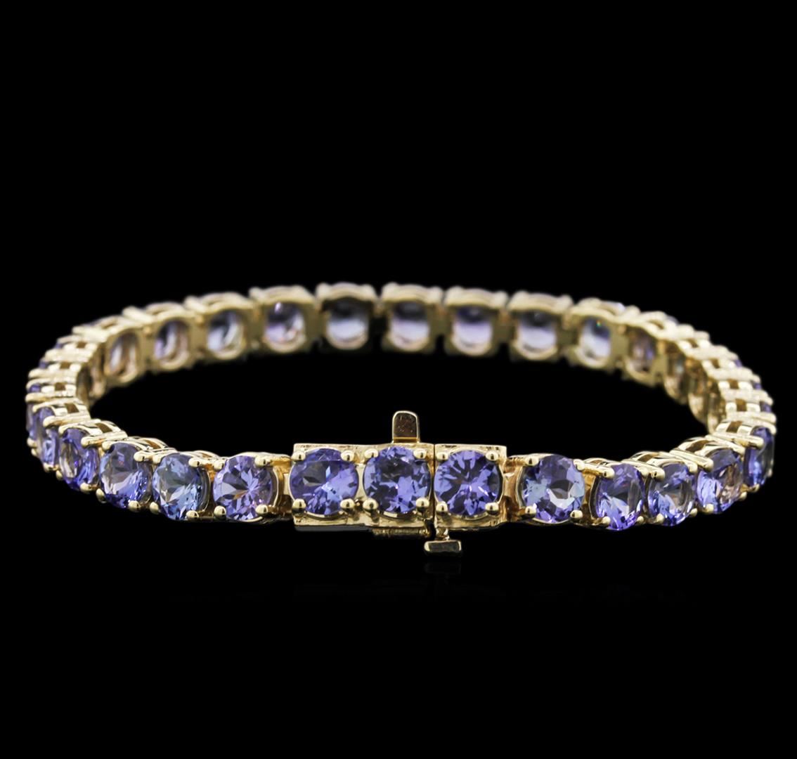 One electronically tested 14KT yellow gold ladies cast tanzanite bracelet with a hidden box clasp with safety closer with a bright polish finish. 7" in length. Identified with markings of "14K". Condition is new. Containing: Thirty prong set round modified brilliant cut natural tanzanites, measuring 5.20 - 5.20 x 3.38 mm, approximate total weight of 17.40ct., clarity is eye clean, type I, medium light, slightly grayish, violet color, (GIA V 4/2), cut is very good. Colored gemstones are presumed to have been subjected to commonly used enhancement processes. All colored gemstones are graded in the mounting, unless otherwise stated. Total Weight of Colored Stones 17.40ct. Total Weight of Bracelet 23.20 grams. GGL Appraised at $7,180.00.