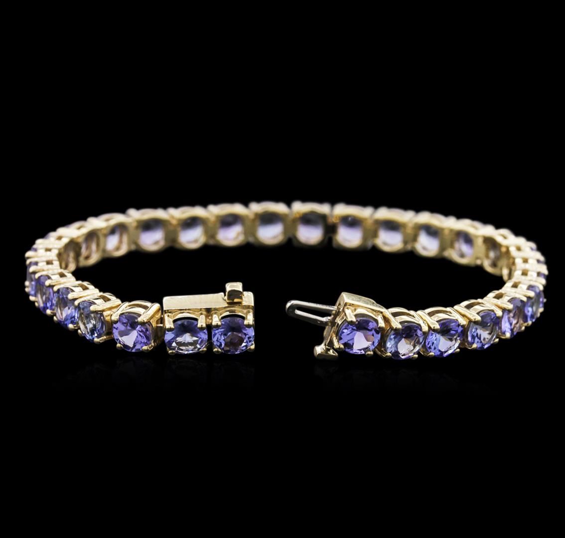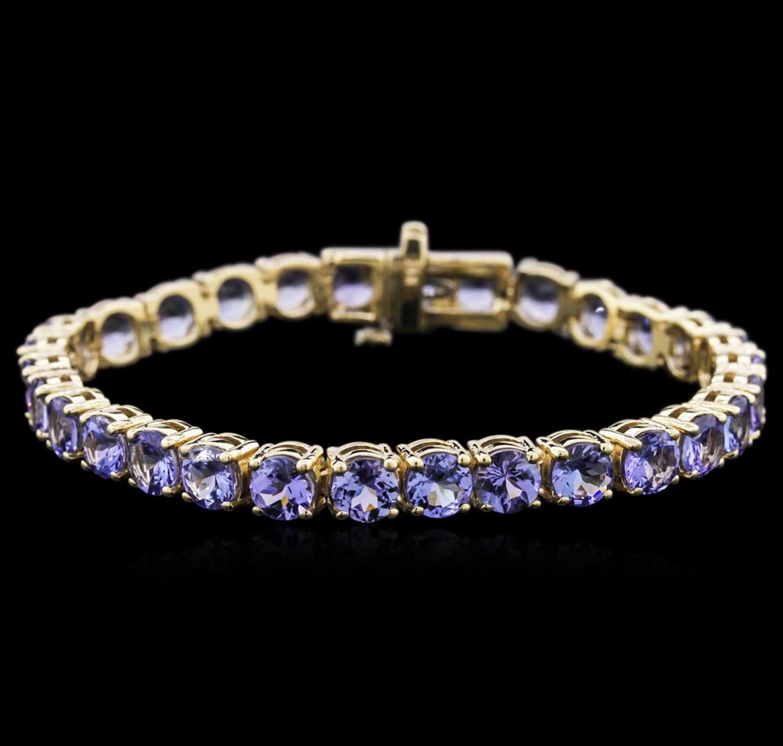One electronically tested 14KT yellow gold ladies cast tanzanite bracelet with a hidden box clasp with safety closer with a bright polish finish. 7" in length. Identified with markings of "14K". Condition is new. Containing: Thirty prong set round modified brilliant cut natural tanzanites, measuring 5.20 - 5.20 x 3.38 mm, approximate total weight of 17.40ct., clarity is eye clean, type I, medium light, slightly grayish, violet color, (GIA V 4/2), cut is very good. Colored gemstones are presumed to have been subjected to commonly used enhancement processes. All colored gemstones are graded in the mounting, unless otherwise stated. Total Weight of Colored Stones 17.40ct. Total Weight of Bracelet 23.20 grams. GGL Appraised at $7,180.00.